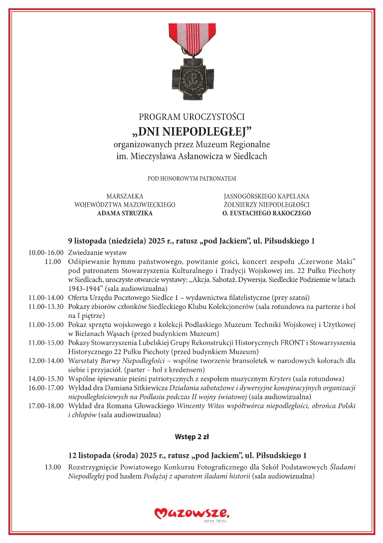 Muzeum Regionalne im. Mieczysława Asłanowicza w Siedlcach zaprasza mieszkańców miasta i regionu na uroczystości „Dni Niepodległej”, które odbędą się 9 i 12 listopada 2025 roku w ratuszu „pod Jackiem” przy ul. Piłsudskiego 1. Patronat honorowy nad obchodami objęli Marszałek Województwa Mazowieckiego Adam Struzik oraz Jasnogórski Kapelan Żołnierzy Niepodległości o. Eustachy Rakoczy.
