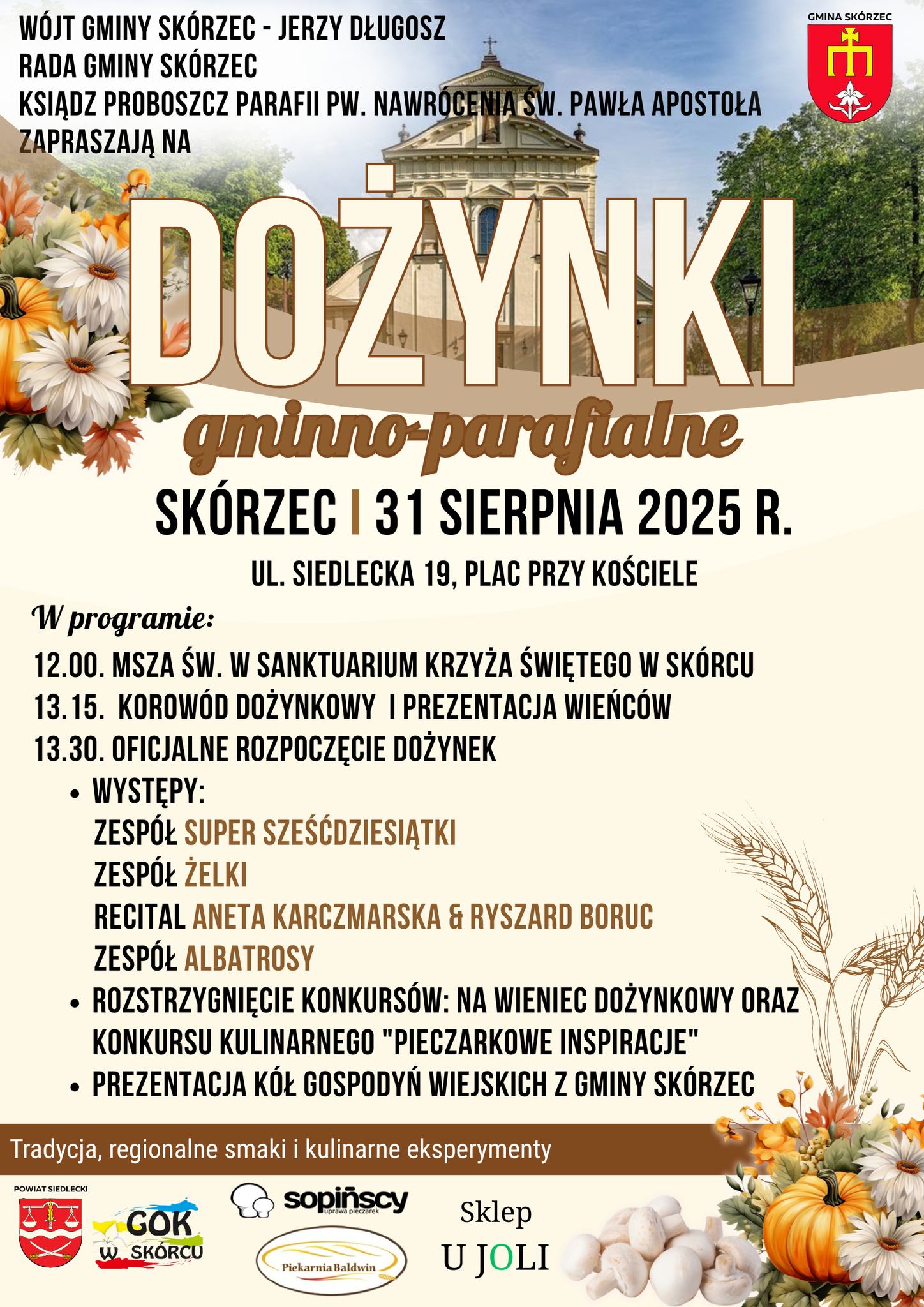 Dożynki Gminno-Parafialne odbędą się w Skórcu w niedzielę, 31 sierpnia. Rozpoczną się Mszą Świętą o godzinie 12:00 na placu przy kościele Nawrócenia św. Pawła Apostoła. W programie przewidziano występy lokalnych zespołów śpiewaczych oraz rozstrzygnięcie konkursów na wieniec dożynkowy i kulinarny pod nazwą „Pieczarkowe inspiracje”.