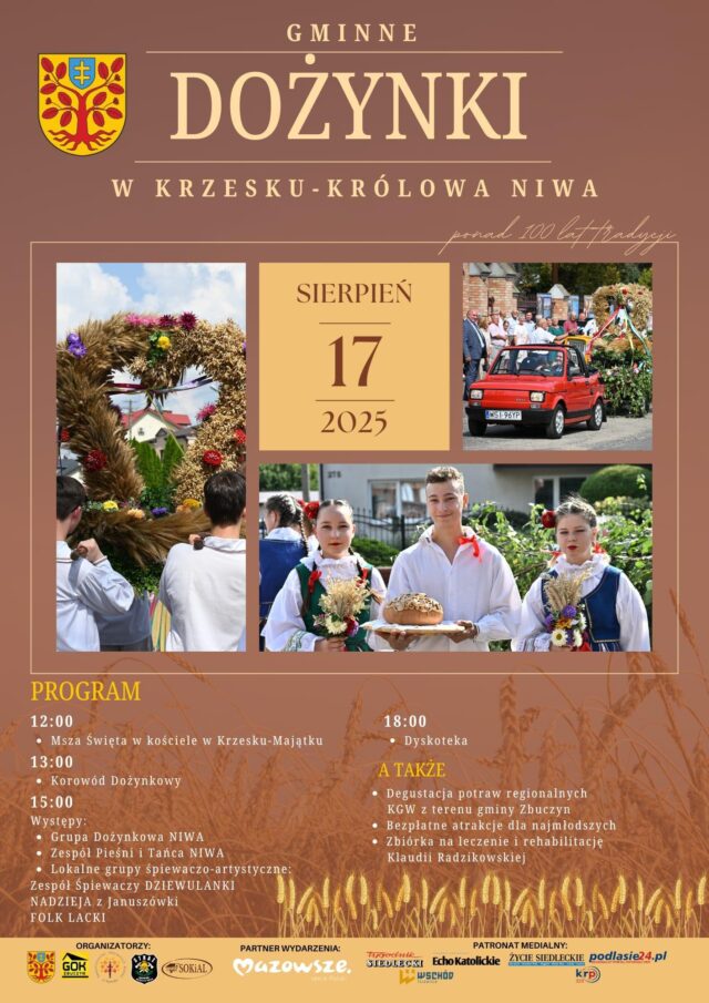 To impreza odbywająca się od ponad stu lat, której organizowania nie przerwały ani wojny, ani kryzysy, ani niedawna epidemia. W dodatku jest robiona oddolnie, z niewielkim tylko udziałem lokalnego samorządu. – To tradycja od pokoleń, one od dziesięcioleci wyglądają praktycznie tak samo. Nie chcemy jako samorząd w tym mieszać. Nie zapraszamy gwiazd, staramy się, aby to miało taki właśnie ludowy charakter i było organizowane przez krzeską młodzież. Jeśli ktoś więc jest ciekawy, jak wyglądały dożynki 50, 70 czy 100 lat temu, to zapraszamy do Krzeska – mówi wójt gminy Zbuczyn, Hubert Pasiak.Krzeskie dożynki rozpoczną się w południe mszą świętą. Potem będzie dożynkowy korowód, występy lokalnych grup artystycznych i dyskoteka. Towarzyszyć im będą stoiska kół gospodyń wiejskich i innych organizacji pozarządowych, zabawy dla dzieci oraz charytatywna zbiórka. Szczegółowy program – na załączonej grafice.
