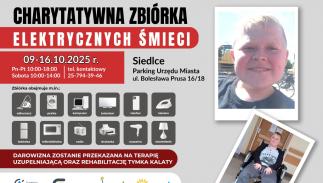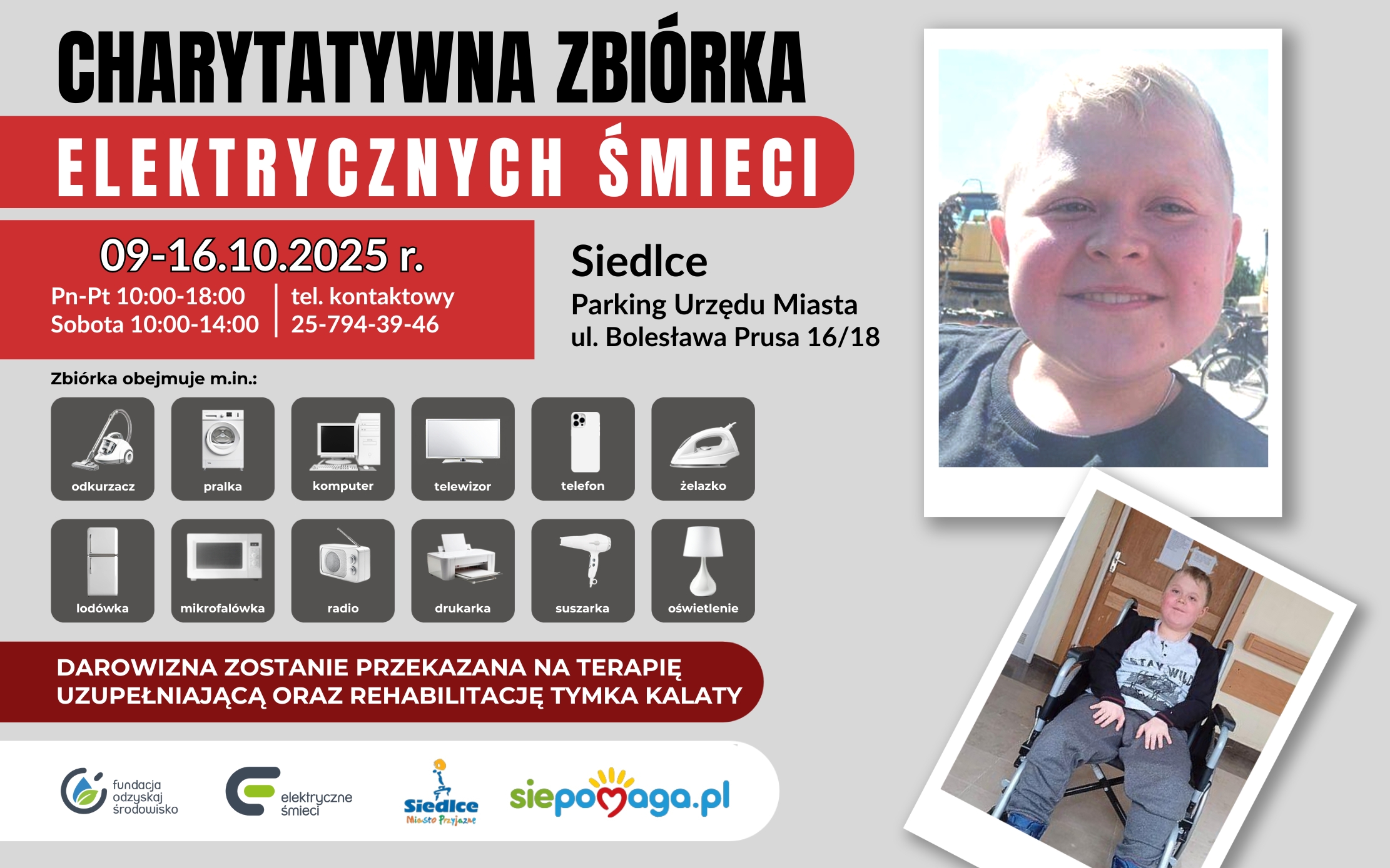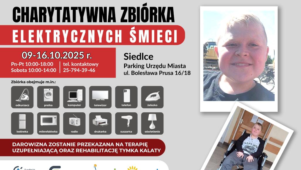 Od 9 do 16 października w Siedlcach prowadzona będzie charytatywna zbiórka elektroodpadów. Dochód z akcji zostanie przeznaczony na leczenie wspomagające i rehabilitację Tymka Kalaty – chłopca chorującego na dystrofię mięśniową Duchenne’a, postępującą chorobę genetyczną powodującą stopniowy zanik mięśni.
