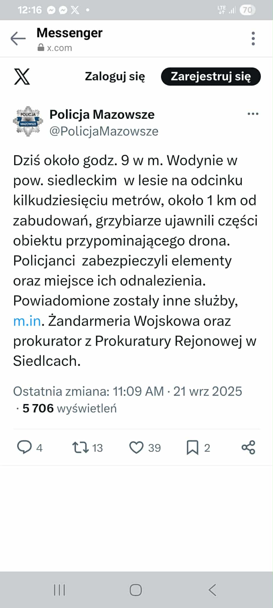 W lesie nieopodal miejscowości Wodynie w powiecie siedleckim ujawniono elementy niezidentyfikowanego obiektu powietrznego, przypominającego drona. Na nietypowe znalezisko natknęli się grzybiarze, którzy poinformowali o sprawie odpowiednie służby.