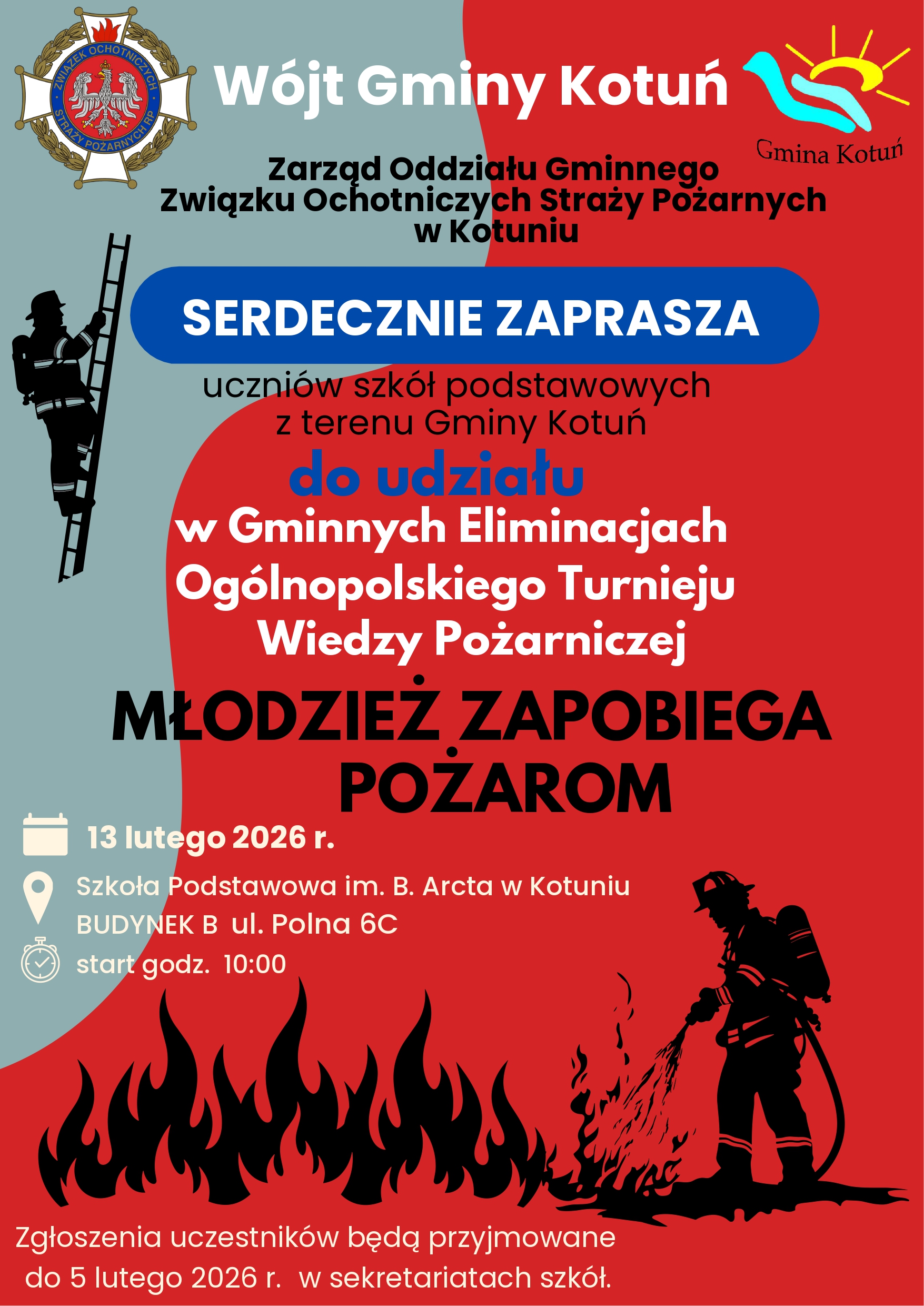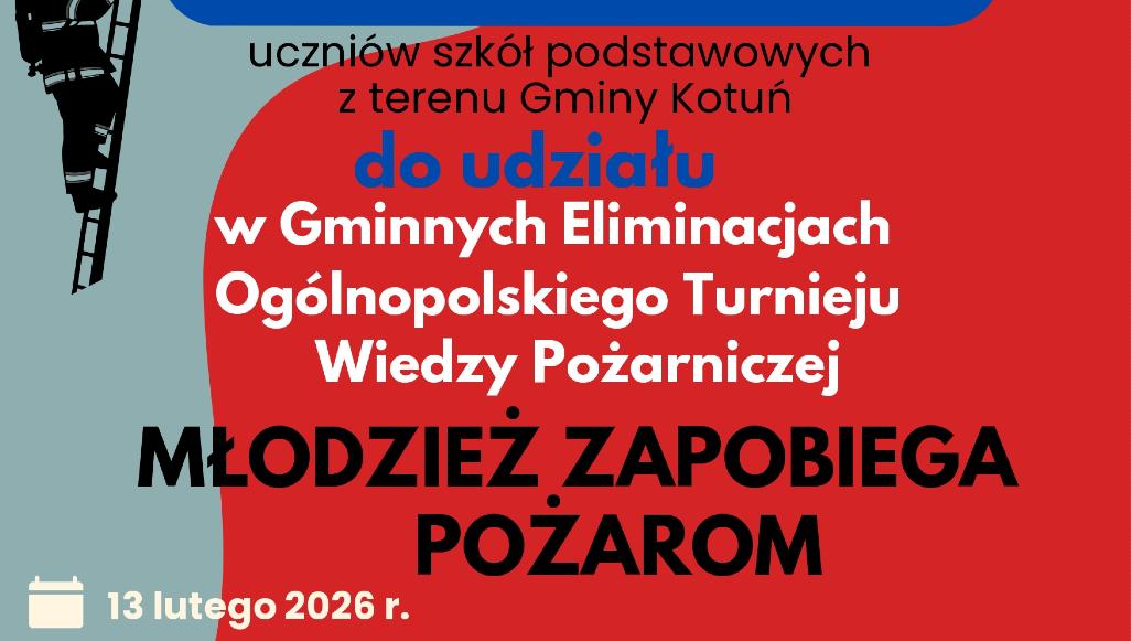 13 lutego w Kotuniu odbędą się gminne eliminacje Ogólnopolskiego Turnieju Wiedzy Pożarniczej „Młodzież Zapobiega Pożarom”. Zmagania rozpoczną się o godz. 10:00 w Szkole Podstawowej w Kotuniu (ul. Polna 6C, budynek B). Zgłoszenia przyjmowane są do 5 lutego w sekretariatach szkół podstawowych z terenu gminy w Kotuniu.