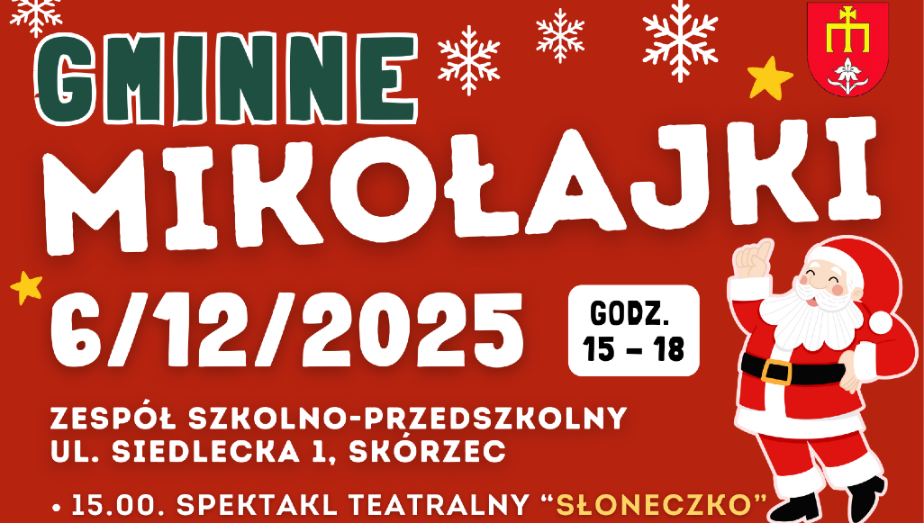Wójt Gminy Skórzec Jerzy Długosz zaprasza dzieci wraz z rodzicami na Gminne Mikołajki, które odbędą się 6 grudnia w godz. 15.00–18.00 w Zespole Szkolno-Przedszkolnym w Skórcu przy ul. Siedleckiej 1.