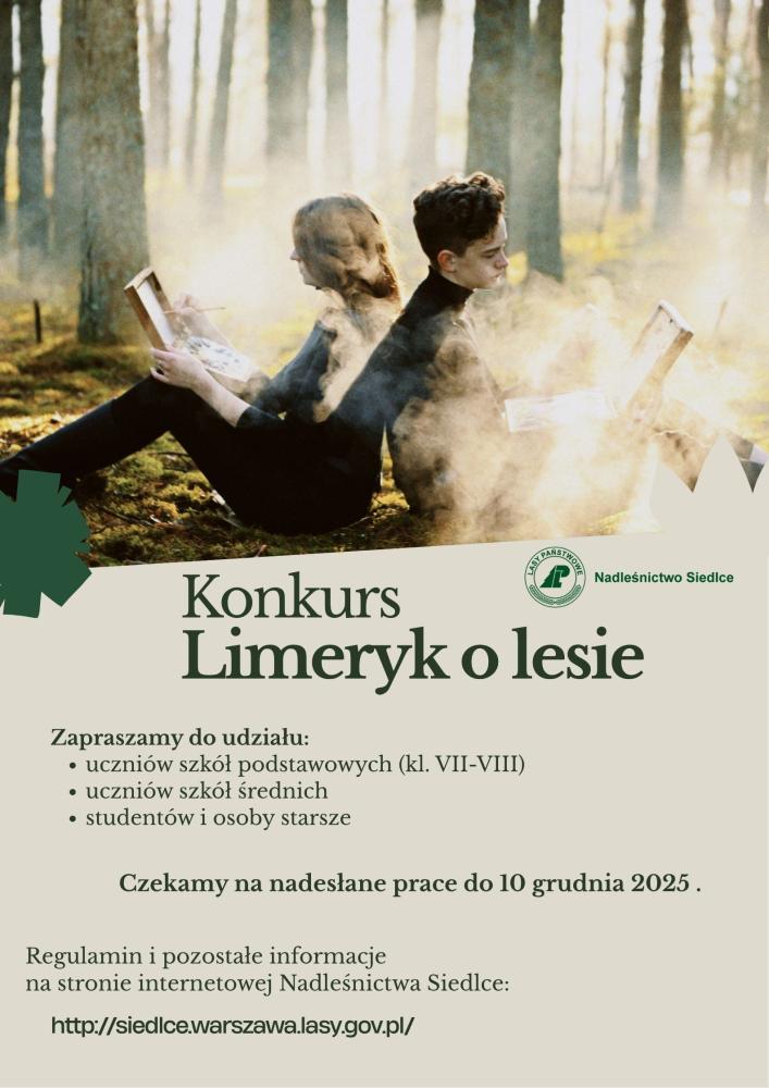 Konkurs jest skierowany do młodzieży szkół podstawowych, ponadpodstawowych, akademickich oraz osób starszych. Celem konkursu jest zachęcenie społeczności do pisania i prezentowania własnej twórczości literackiej oraz zainteresowania tematyką leśną. Uczestnicy konkursu będą musieli napisać limeryk o tematyce leśnej.Prace konkursowe należy nadsyłać do 10 grudnia. Nadesłane limeryki będą oceniane w 3 kategoriach wiekowych: -uczniowie klas VII, VIII szkoły podstawowej, - uczniowie szkół ponadpodstawowych, - studenci i osoby starsze. Na laureatów czekają dyplomy oraz nagrody książkowe. Rozstrzygnięcie konkursu odbędzie się 19.12.2025 r. Więcej szczegółów na stronie Nadleśnictwa Siedlce.