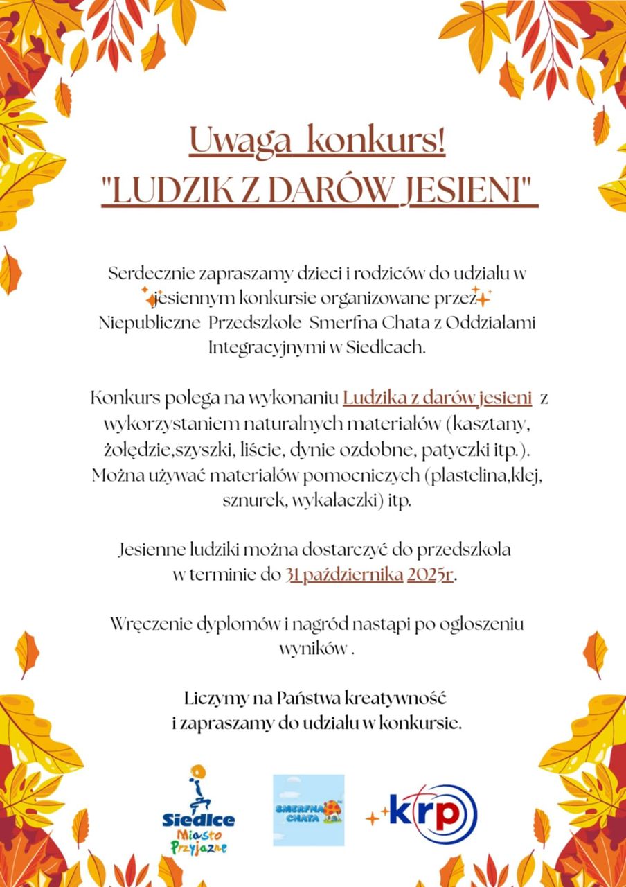 Ruszyły zgłoszenia do konkursu plastyczno-przestrzennego dla przedszkolaków pod hasłem „Ludzik z darów jesieni”. Organizatorem konkursu jest Niepubliczne Przedszkole Smerfna Chata z Oddziałami Integracyjnymi w Siedlcach. Patronuje mu Katolickie Radio Podlasie i portal Podlasie24.