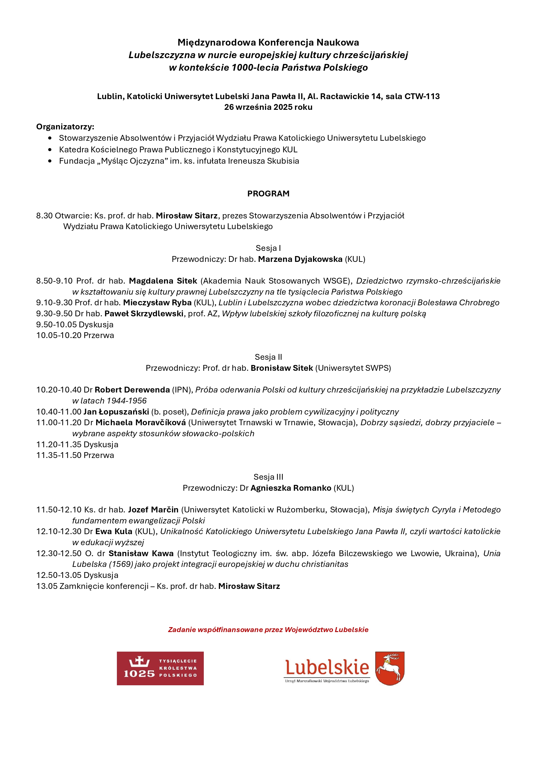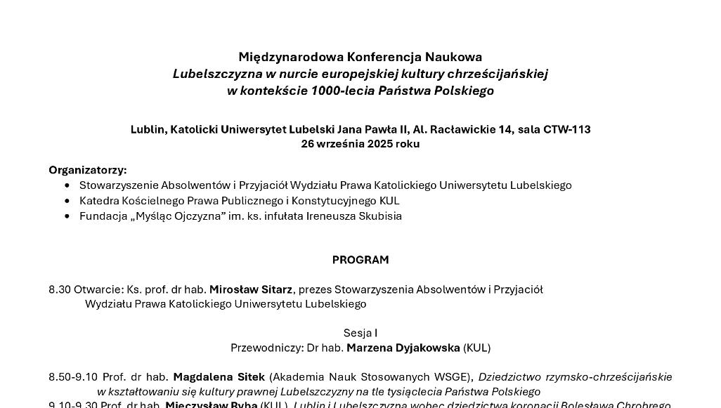 Organizatorami są: Stowarzyszenie Absolwentów i Przyjaciół Wydziału Prawa KUL, Katedra Kościelnego Prawa Publicznego i Konstytucyjnego oraz Fundacja „Myśląc Ojczyzna” im. ks. inf. Ireneusza Skubisia. Inicjatywa wpisuje się w obchody tysiąclecia państwowości Polski i podkreśla znaczenie Lubelszczyzny jako regionu współtworzącego dziedzictwo chrześcijańskiej Europy.Program konferencji podzielono na trzy sesje tematyczne. Pierwsza, prowadzona przez dr hab. Marzenę Dyjakowską, obejmie referaty m.in. prof. dr hab. Magdaleny Sitek, prof. dr hab. Mieczysława Ryby oraz prof. AZ Pawła Skrzydlewskiego. Poruszone zostaną kwestie dziedzictwa rzymsko-chrześcijańskiego w kulturze prawnej regionu, znaczenia koronacji Bolesława Chrobrego oraz wpływu lubelskiej szkoły filozoficznej na kulturę narodową.