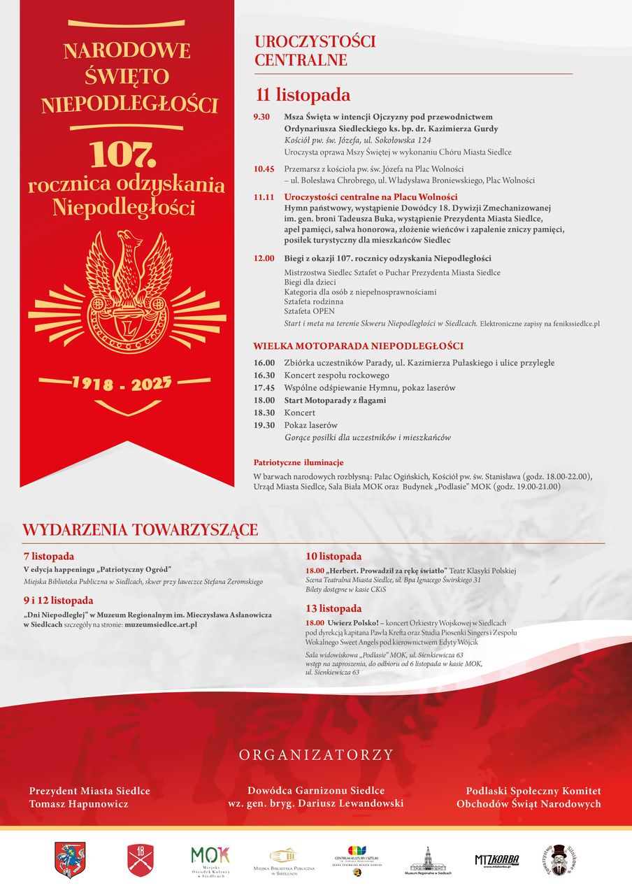 Msza Święta rozpocznie się o godzinie 9:30. Po wspólnej modlitwie uczestnicy obchodów przejdą z kościoła na Plac Wolności, gdzie o godzinie 11.11 rozpoczną się uroczystości centralne. W programie zaplanowano m.in. odśpiewanie hymnu państwowego, wystąpienie Dowódcy 18. Dywizji Zmechanizowanej im. gen. broni Tadeusza Buka, wystąpienie prezydenta Siedlec, apel pamięci, salwę honorową oraz złożenie wieńców i zapalenie zniczy pamięci.O godzinie 12:00 rozpoczną się biegi z okazji 107. rocznicy odzyskania niepodległości. Popołudniu, o godzinie 16:00 rozpocznie się Wielka Moto-Parada Niepodległości. Wydarzenie to zakończy koncert i pokaz laserów.