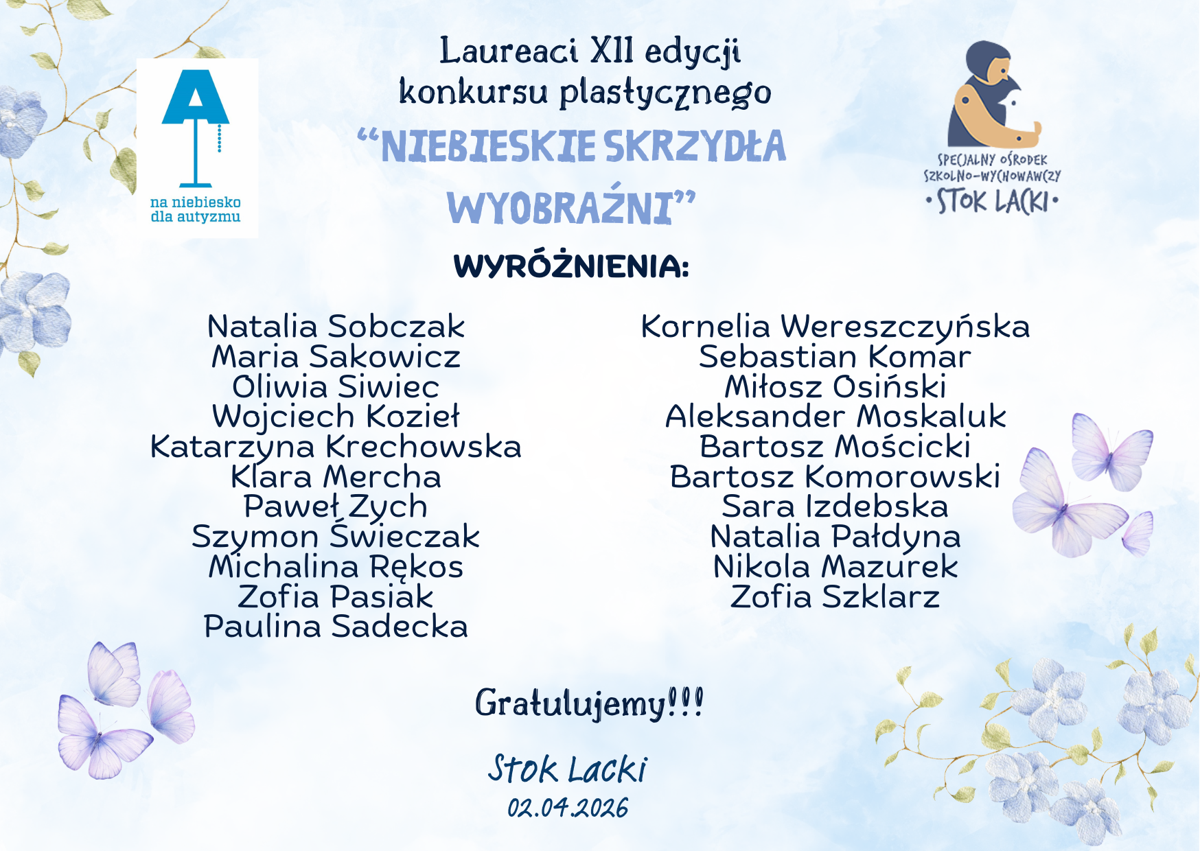 Światowy Dzień Świadomości Autyzmu, który obchodzony jest co roku 2 kwietnia, już za nami. Wieloletnią tradycją Specjalnego Ośrodka Szkolno-Wychowawczego w Stoku Lackim jest organizacja z tej okazji konkursu plastycznego. Odbywał się on pod hasłem „Niebieskie skrzydła wyobraźni” i poznaliśmy już jego zwycięzców.