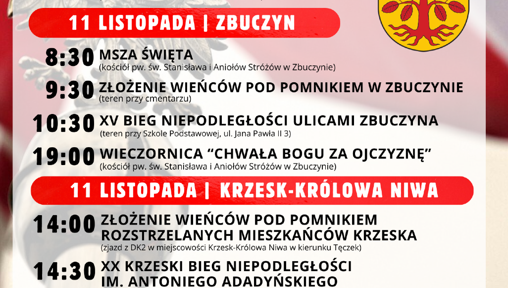 Gmina Zbuczyn zaprasza mieszkańców do wspólnego świętowania 106. rocznicy odzyskania przez Polskę niepodległości. Wydarzenia patriotyczne, sportowe i artystyczne odbędą się w dniach od 9 do 12 listopada w Dziewulach, Zbuczynie oraz Krzesku-Królowej Niwie.