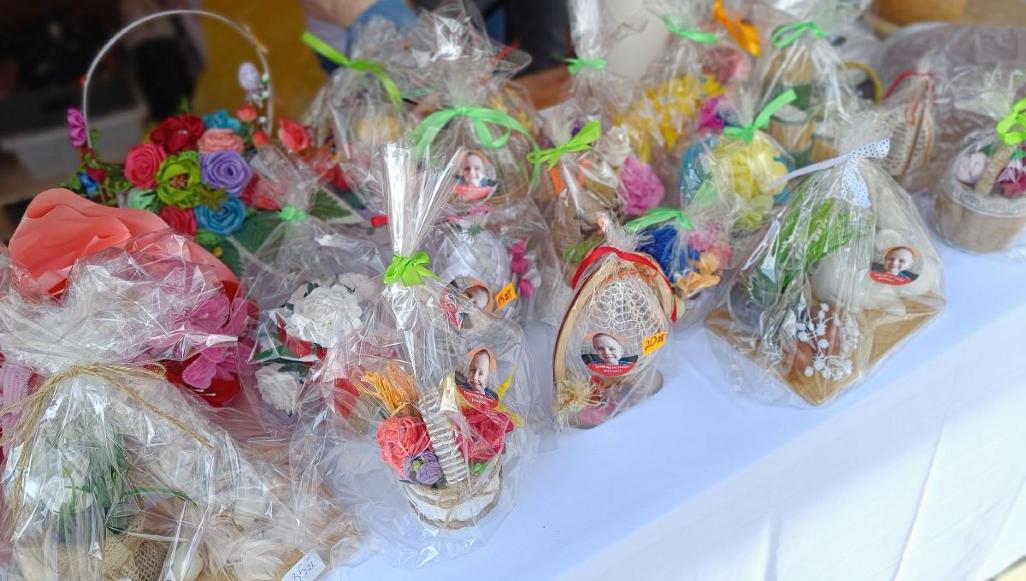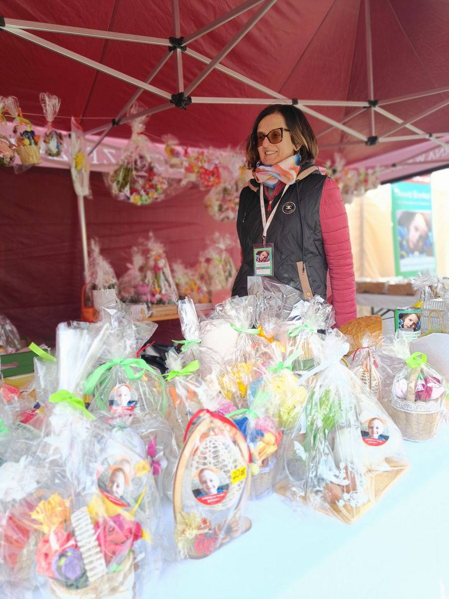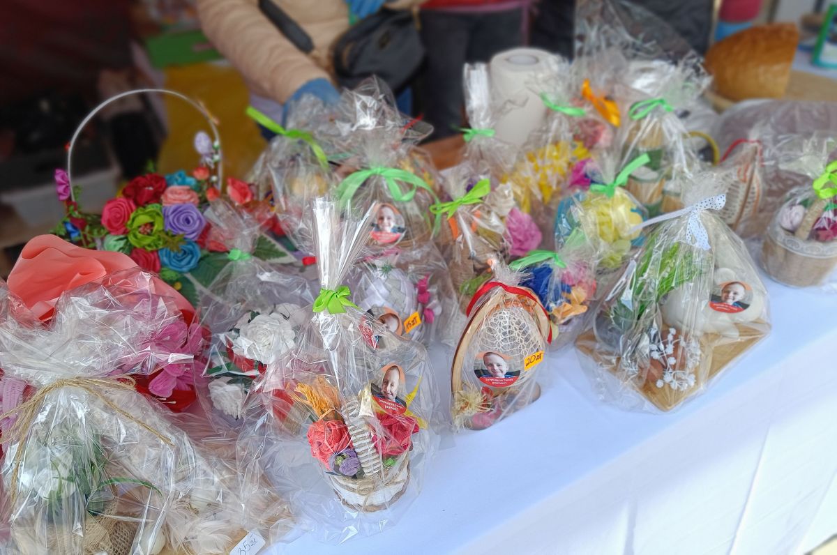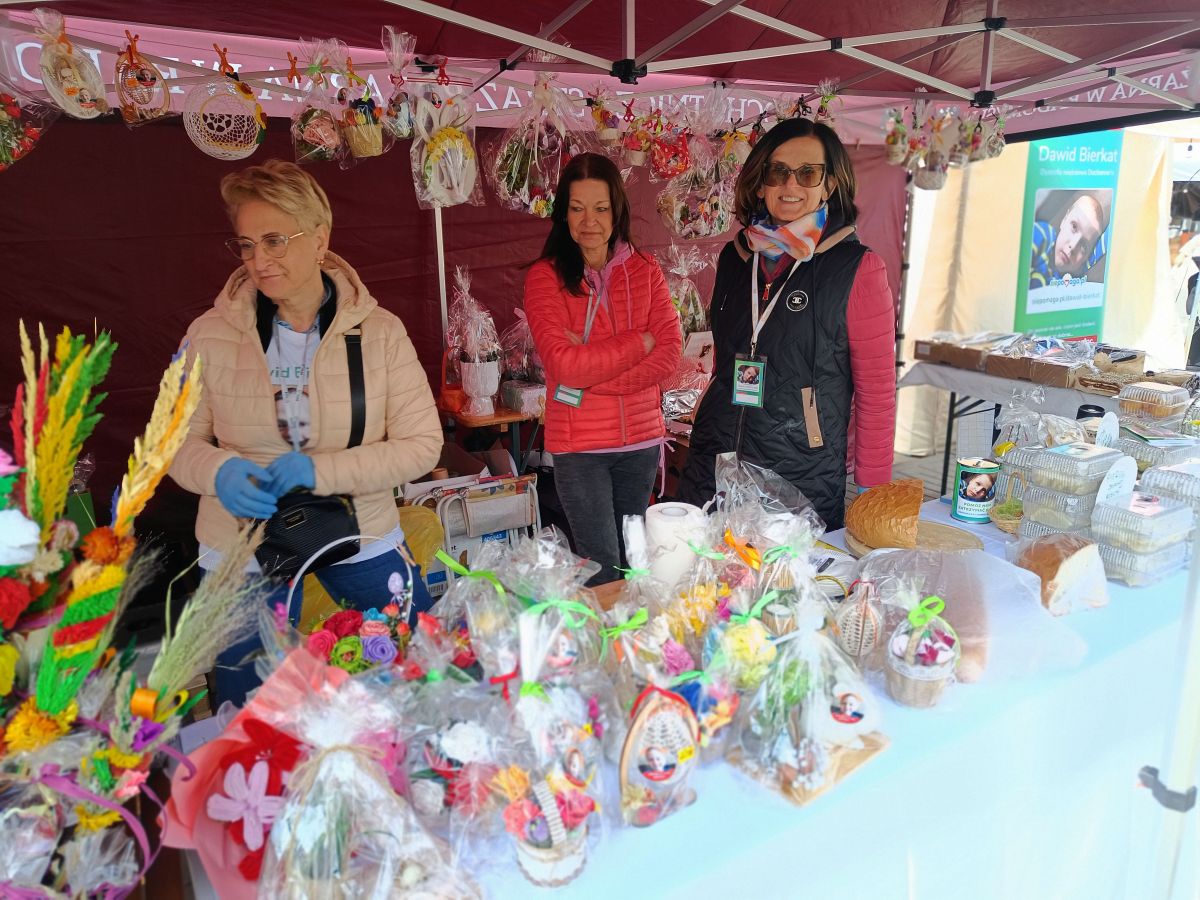 Na innym stoisku wszystkie przedmioty sprzedawane są z myślą o leczeniu chorego na dystrofię mięśniową Dawida Bierkata. W przygotowanie świątecznych ozdób i produktów spożywczych włączyły się liczne instytucje i organizacje. Wyliczały nam je: Barbara Borkowska i Renata Dylewska: – Warsztaty terapii zajęciowej, zakład doskonalenia zawodowego, zakład aktywności zawodowej, szkoła „Żak”, piekarnia Domanice, koła gospodyń wiejskich z Kisielan, Hołubli, Mokobód i Dziewul, szkoła podstawowa w Paprotni, ochotnicza straż z Radomyśli. Mamy tu w związku z tym pewien misz-masz, ale to wszystko jest dla państwa, żeby wspomóc Dawida.