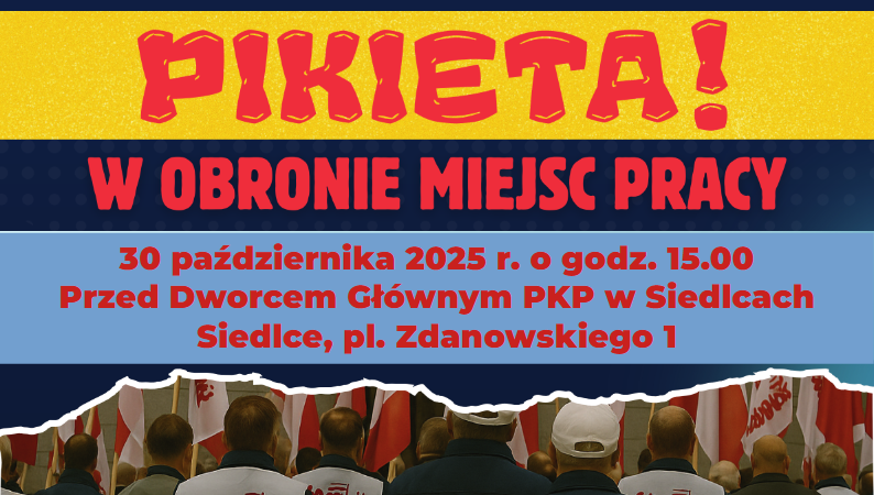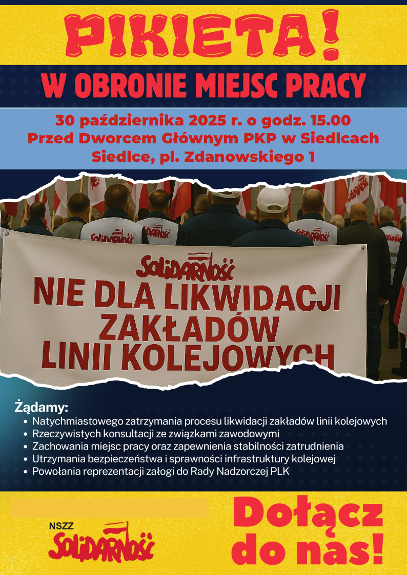 Przed Dworcem Głównym PKP w Siedlcach 30 października o godzinie 15:00 odbędzie się pikieta zorganizowana przez NSZZ „Solidarność”. Związkowcy zapowiadają protest przeciwko planom likwidacji zakładów linii kolejowych.