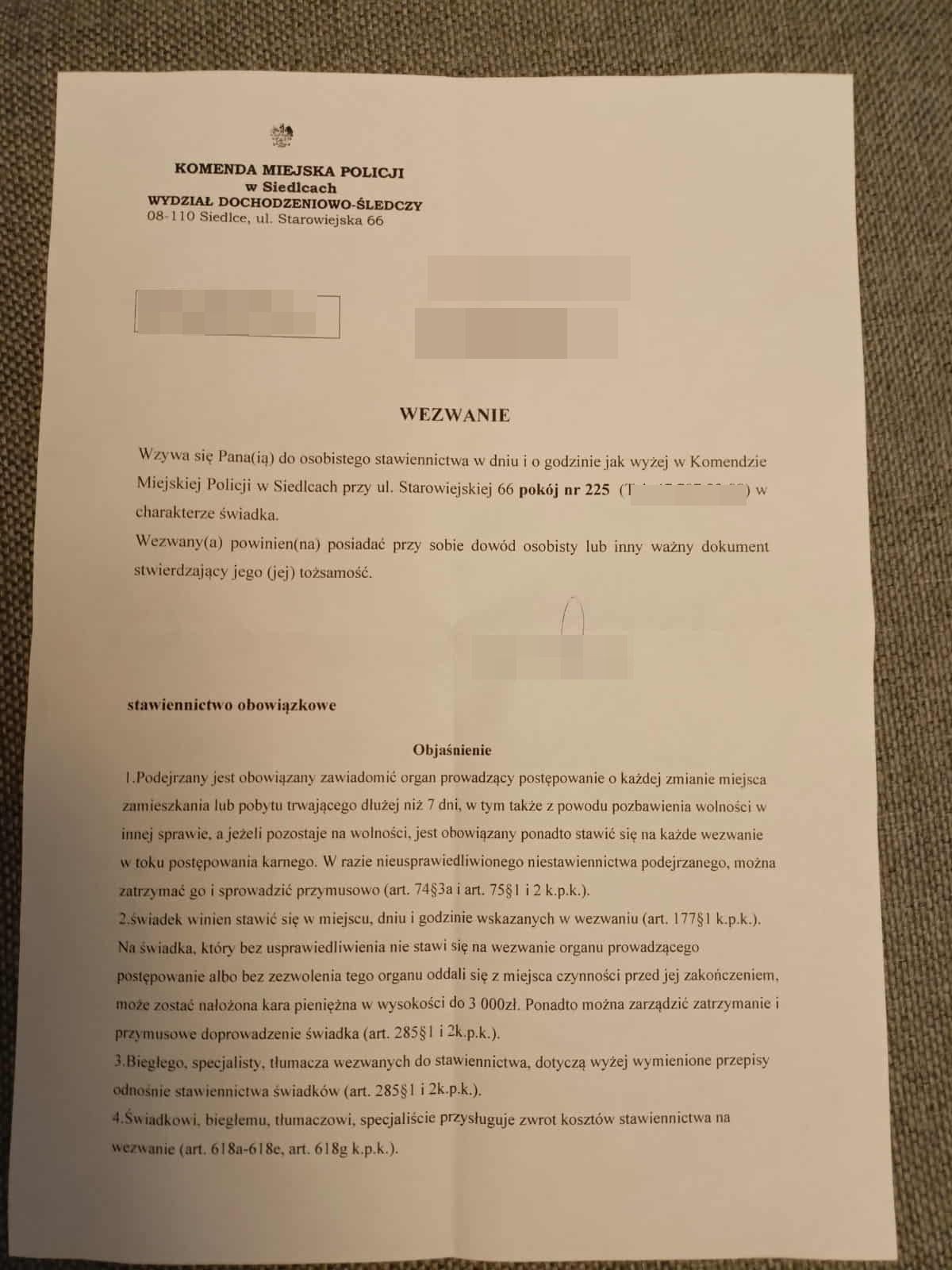 Jak ustaliła nasza redakcja, wezwania do stawienia się na policję otrzymało już kilku członków obwodowych komisji wyborczych z Siedlec. Jedna z mieszkanek Siedlec, która pracowała w komisji podczas wyborów, relacjonuje: – Wezwanie przyszło z dnia na dzień, z ostrzeżeniem o konsekwencjach za niestawienie się. Nie wiedziałam, o co chodzi. Dopiero na komendzie dowiedziałam się, że chodzi o wybory prezydenckie – mówi kobieta.