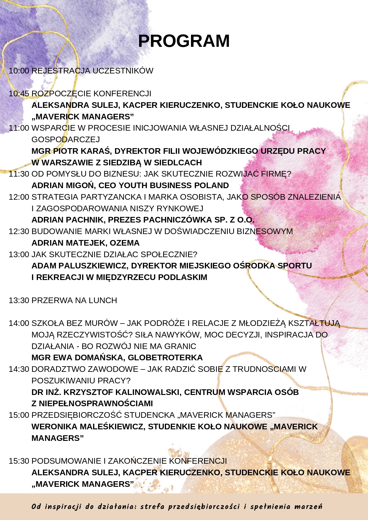 W programie znalazły się wystąpienia ekspertów z zakresu przedsiębiorczości, doradztwa zawodowego, działań społecznych i rozwoju osobistego. Uczestnicy będą mieli okazję posłuchać o zakładaniu i prowadzeniu własnego biznesu, budowaniu marki osobistej oraz sposobach na odnalezienie się w dynamicznie zmieniającym się rynku pracy.Konferencję patronatem medialnym objęły Katolickie Radio Podlasie i Regionalny Portal Informacyjny podlasie24.pl
