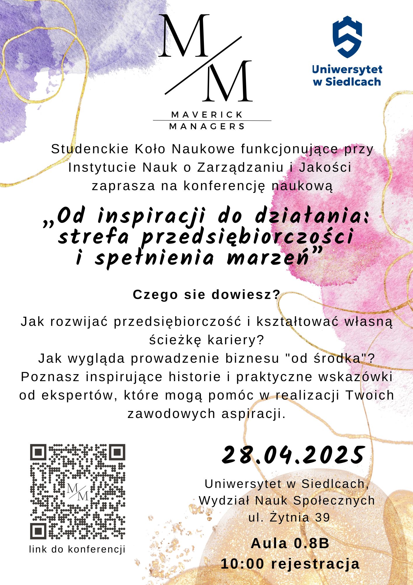 „Od inspiracji do działania: strefa przedsiębiorczości i spełnienia marzeń” to konferencja organizowana przez Studenckie Koło Naukowe „Maverick Managers”. Odbędzie się 28 kwietnia na Wydziale Nauk Społecznych Uniwersytetu w Siedlcach.
