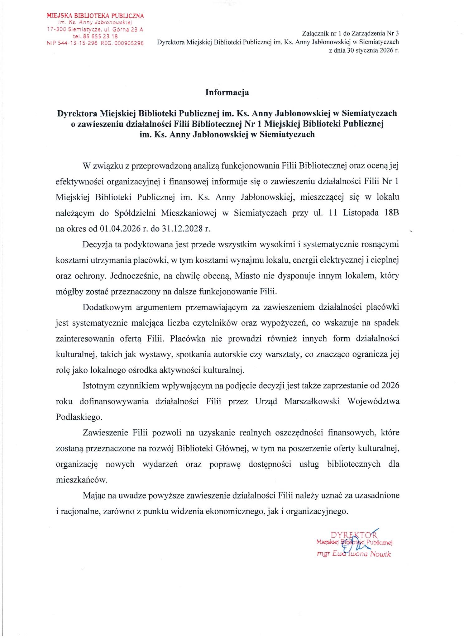 Poniżej publikujemy pełną treść informacji opublikowanej na FB Filii Biblioteki, tj. zarządzenia podpisanego przez Ewę Nowik, dyrektor MBP w Siemiatyczach: