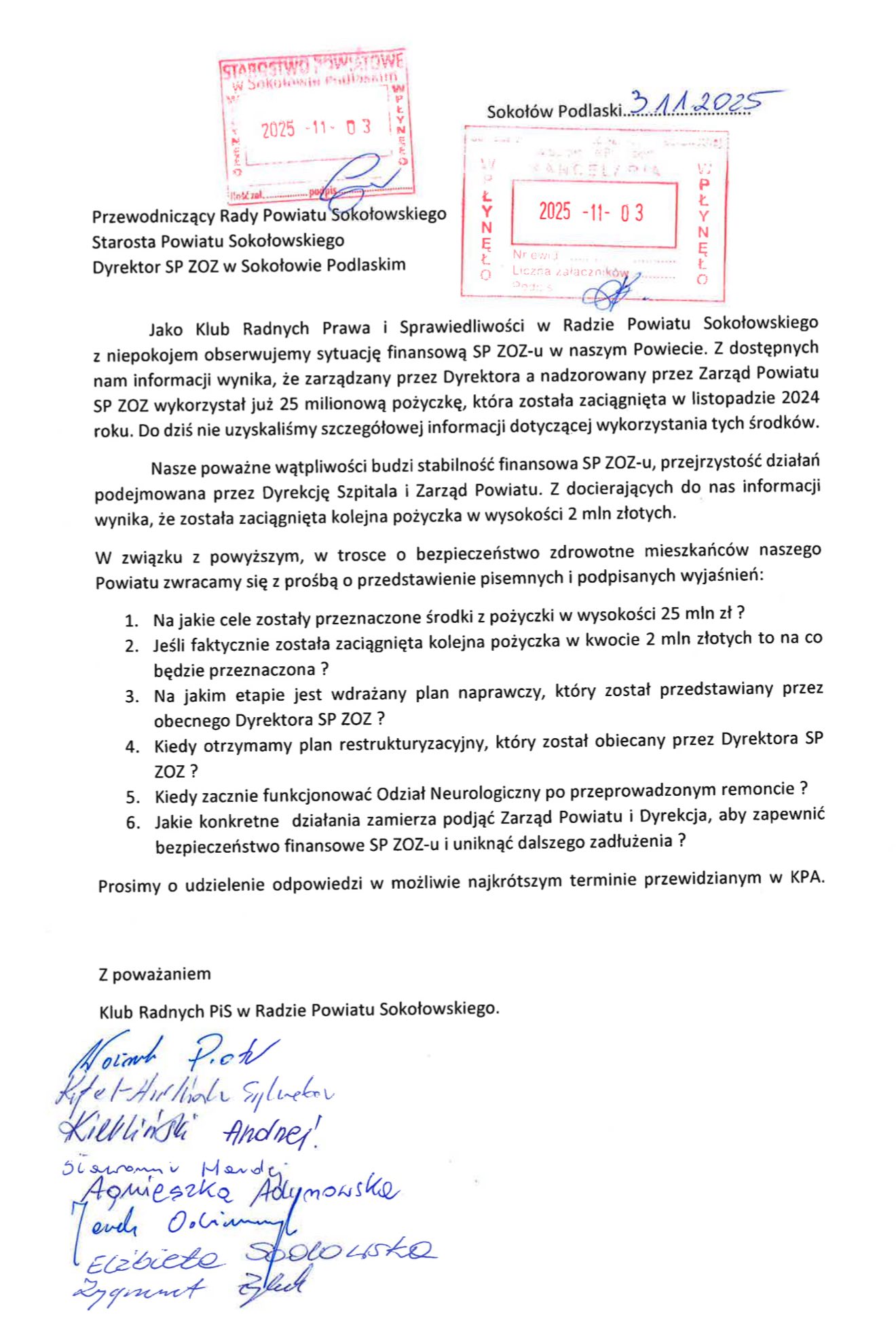 Sytuacja finansowa Szpitala Powiatowego w Sokołowie Podlaskim wzbudziła niepokój radnych powiatowych Prawa i Sprawiedliwości. Klub radnych złożył w tej sprawie pisma do dyrekcji szpitala, starosty oraz przewodniczącego Rady Powiatu, domagając się wyjaśnień. Chodzi m.in. o sposób wykorzystania pożyczki w wysokości 25 milionów złotych oraz o realizację planu naprawy finansów placówki.