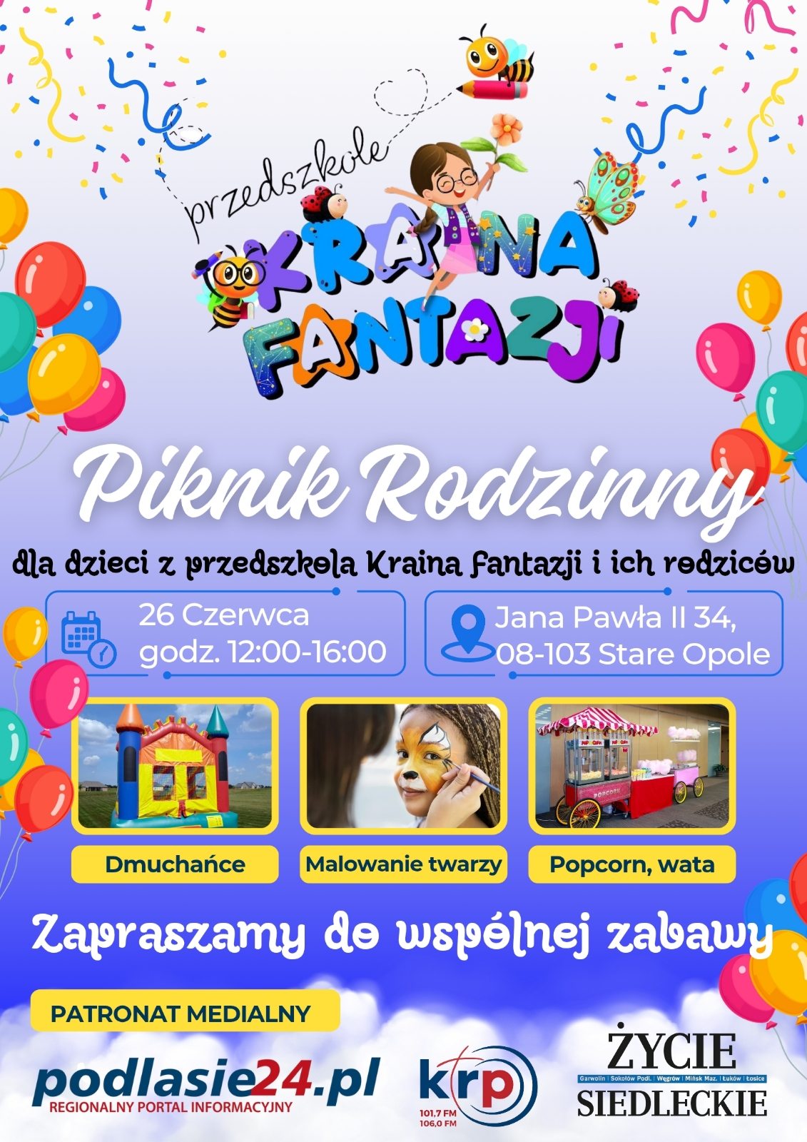 Rodzinny piknik przedszkola „Kraina Fantazji” odbędzie się na placu obok sali Imperium w Starym Opolu w czwartek, 26 czerwca. Kolorowa i radosna atmosfera towarzyszyć będzie dzieciom, ich rodzicom oraz całej społeczności przedszkolnej.