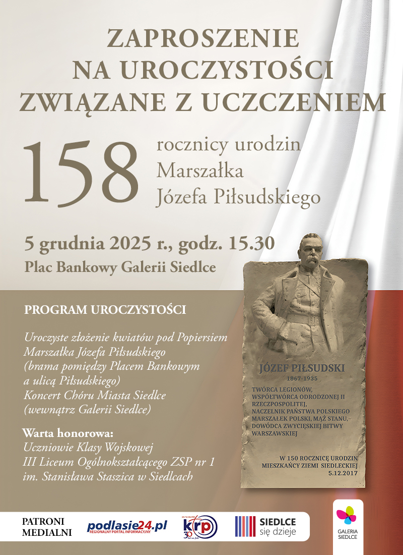 5 grudnia przy tablicy pamiątkowej Marszałka Józefa Piłsudskiego przy ul. Piłsudskiego 70, obok Galerii Siedlce, odbędą się obchody 158. rocznicy urodzin Marszałka Józefa Piłsudskiego. Program przewiduje zarówno część oficjalną, jak i akcent artystyczny.