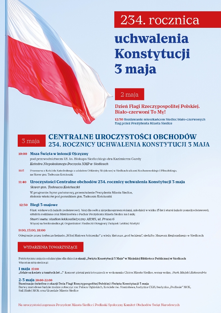 W dniach od 1 do 3 maja w Siedlcach odbędą się obchody 234. rocznicy uchwalenia Konstytucji 3 Maja oraz Dnia Flagi Rzeczypospolitej Polskiej. W programie znajdą się zarówno uroczystości patriotyczne, jak i wydarzenia towarzyszące – koncert, iluminacje, edukacyjne zajęcia dla dzieci oraz biegi 3-majowe.