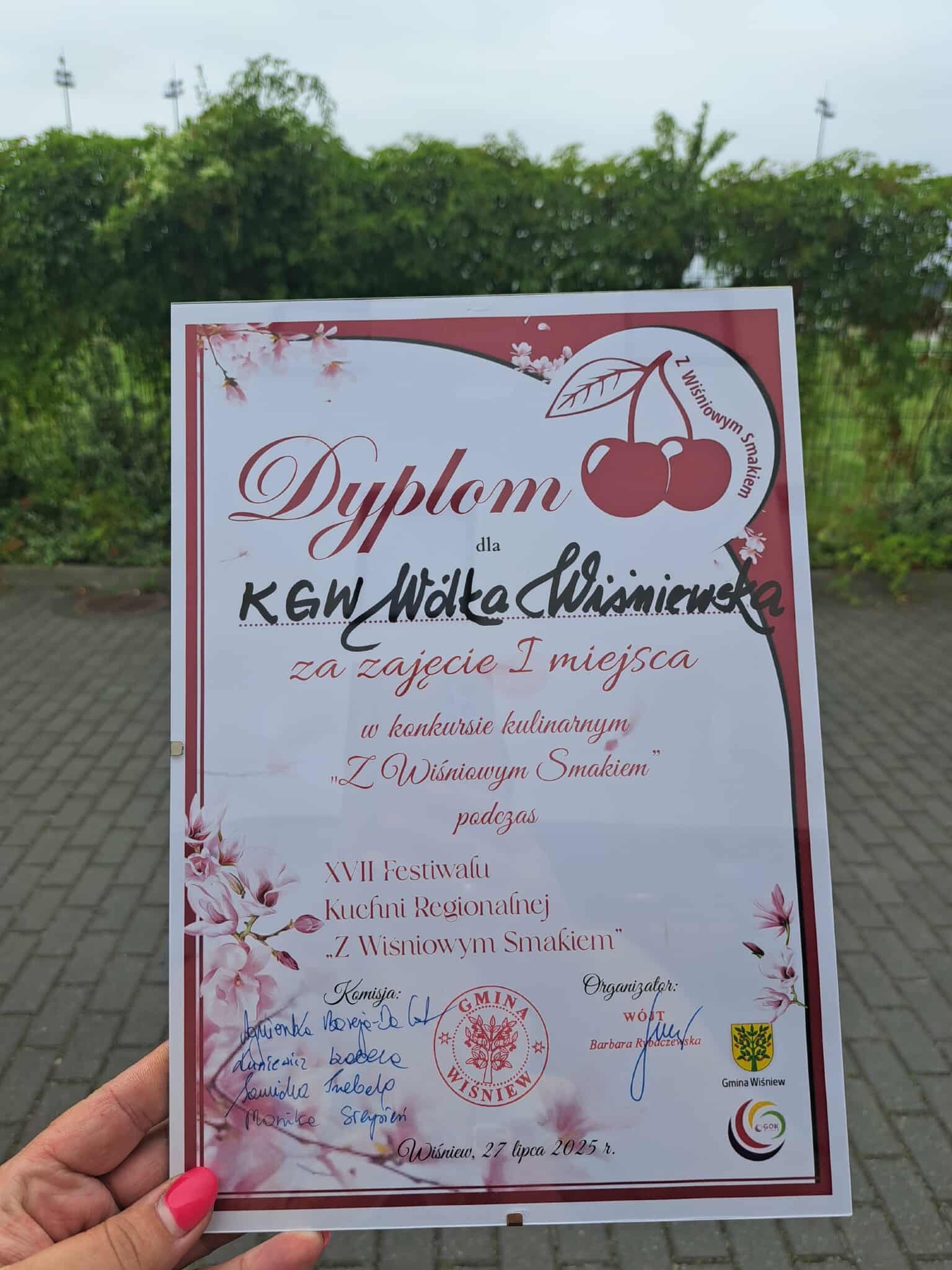 Rubinowa harmonia, czyli miodowa polędwiczka wieprzowa z sosem wiśniowym i karmelizowaną wiśnią, oraz makaroniki kawowe z wiśnią – za te smakołyki Koło Gospodyń Wiejskich z Wólki Wiśniewskiej otrzymało pierwszą nagrodę w konkursie kulinarnym podczas XVII Festiwalu Kuchni Regionalnej „Z wiśniowym smakiem”.