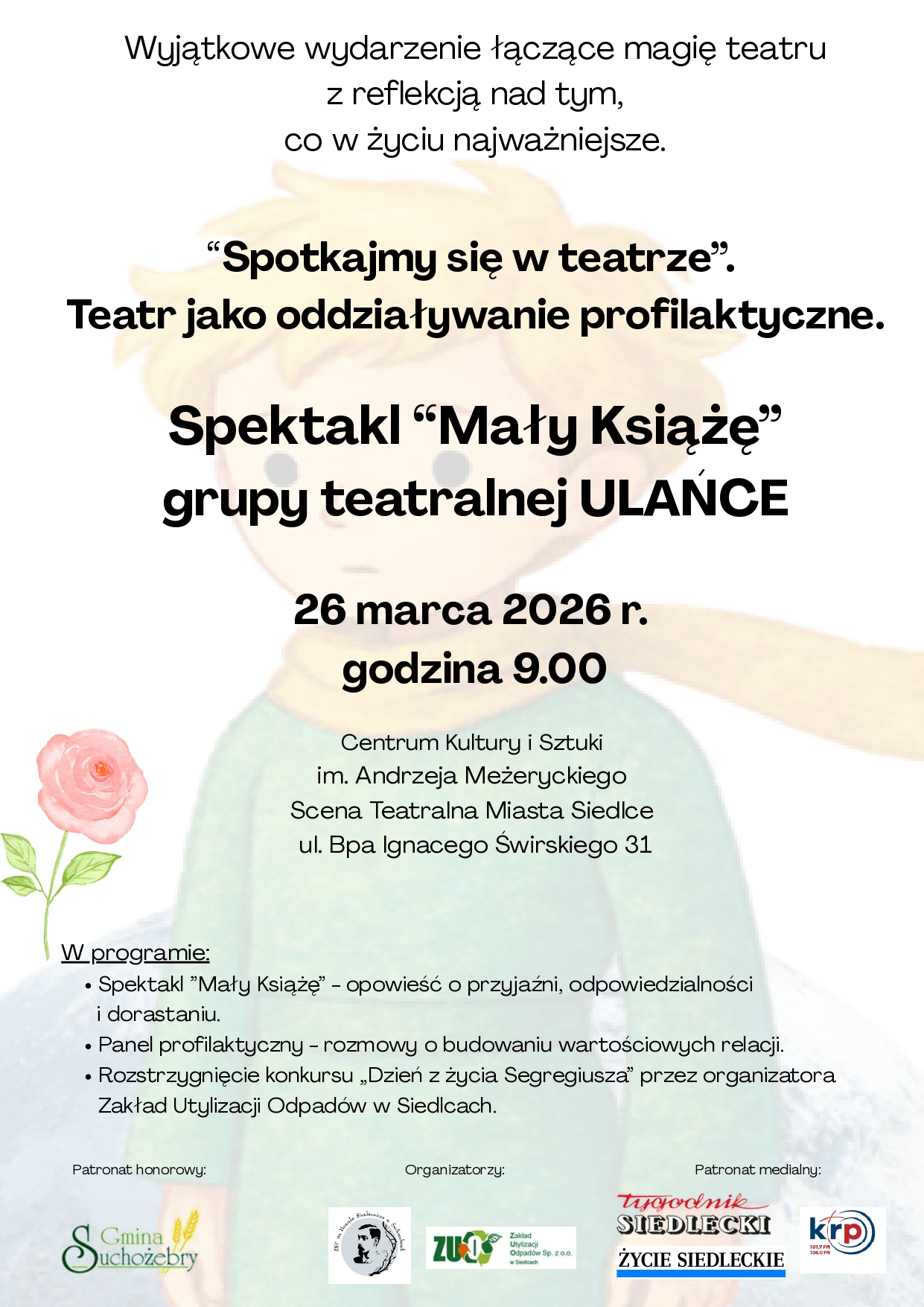 Organizatorzy zaplanowali m.in. inscenizację teatralną na podstawie książki „Mały książę”, poruszającą siłę ludzkiej przyjaźni, mówiącą o odpowiedzialności i dorastaniu zaprezentowaną przez grupę teatralną „Ulańce”. Po spektaklu, odbędzie się panel profilaktyczny na temat budowania wartościowych relacji. Zwieńczeniem wydarzenia będzie rozstrzygnięcie konkursu na komiks pod hasłem „Dzień z życia Segregiusza”, który zorganizował Zakład Utylizacji Odpadów w Siedlcach.Agnieszką Budek, dyrektor Zespołu Szkół Publicznych im. Henryka Sienkiewicza w Suchożebrach podkreśla, że poruszanie tematu relacji wśród dzieci i młodzieży jest ważne szczególnie jeśli chodzi o współczesny problem wykluczenia, brak zrozumienia, a także mniejszą wrażliwość na problemy innych. Dyrektor placówki dodaje, że przygotowując spotkanie profilaktyczne szkoła bazuje na lekturach szkolnych, które starają się odnieść na współczesne problemy relacji dzieci i młodzieży, problemy z ich wzajemną komunikacją między sobą.