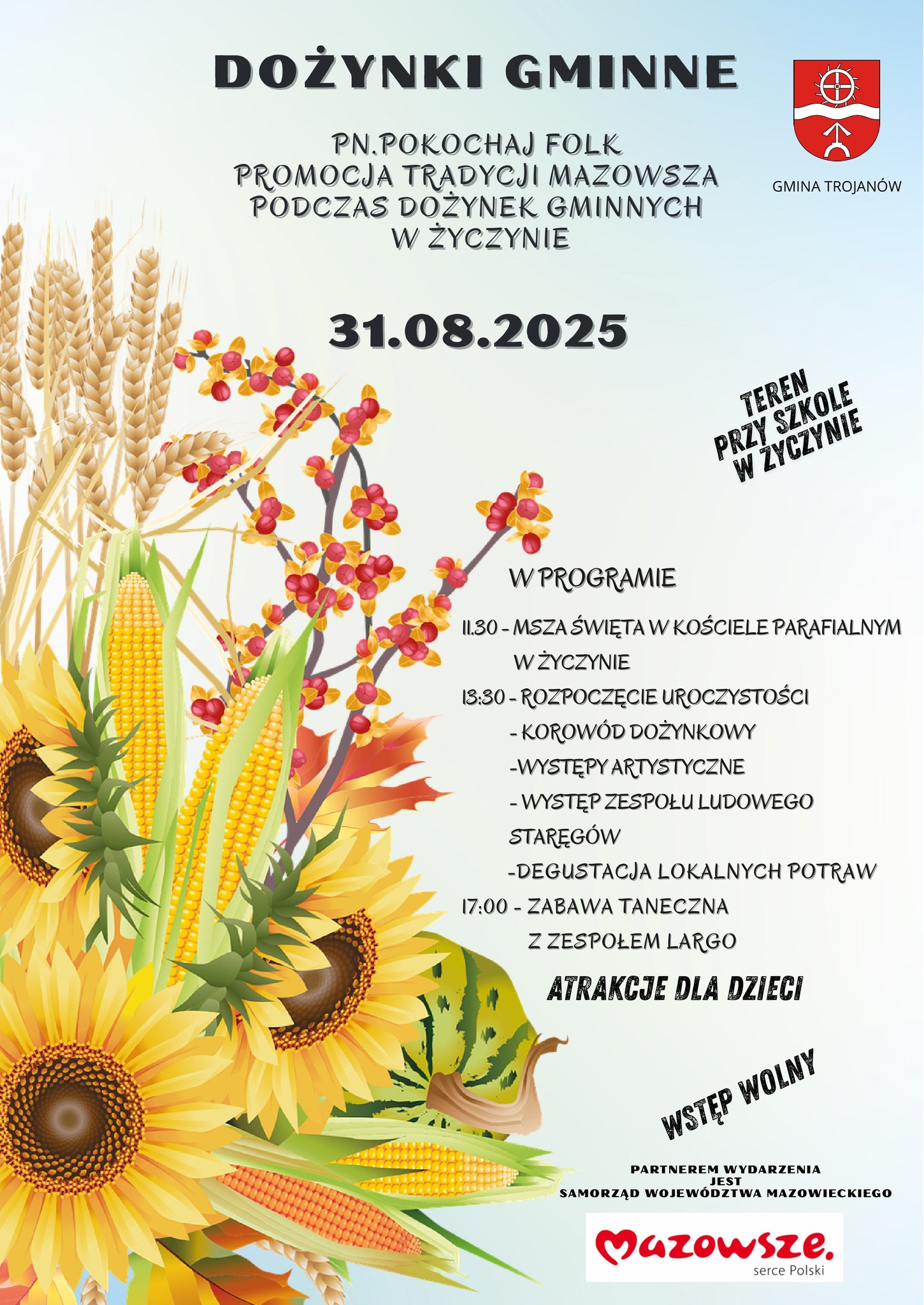 To wyjątkowe święto plonów będzie okazją do wspólnego dziękowania za całoroczny trud rolników, integracji lokalnej społeczności oraz wspólnej zabawy przy muzyce, tańcu i regionalnych smakach. Uroczystości rozpoczną się Mszą świętą odprawioną o godz. 11:30 w kościele parafialnym w Życzynie, następnie barwny korowód przejdzie na teren przy szkole podstawowej, gdzie na uczestników czeka wiele atrakcji, m.in. występy artystyczne, w tym znanej i lubianej Kapeli Staręgów, degustacja potraw, kiermasz dożynkowy z lokalnymi produktami, strefa animacji dla dzieci i wiele innych.Organizatorem wydarzenia jest Gmina Trojanów, a partnerem samorząd województwa mazowieckiego.