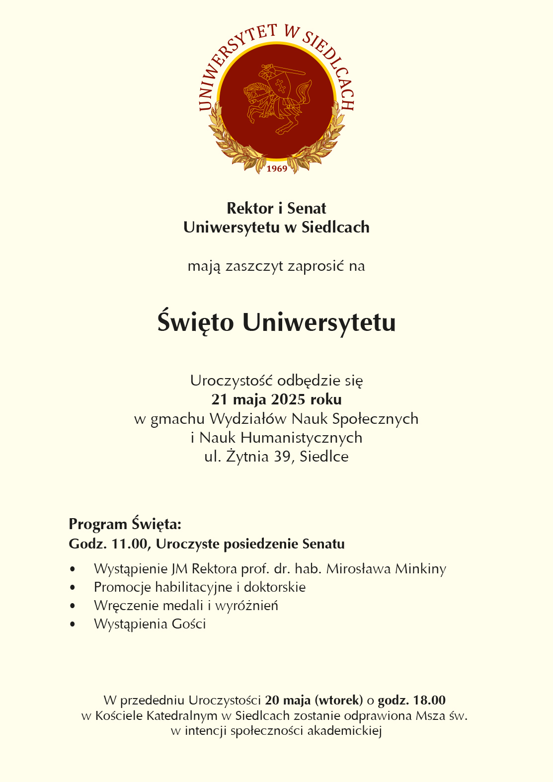 Uniwersytet w Siedlcach przygotowuje się do uroczystych obchodów swojego święta. Tegoroczne wydarzenie zaplanowano na środę, 21 maja. Rozpocznie się ono o godzinie 11:00 w gmachu Wydziałów Nauk Społecznych i Nauk Humanistycznych przy ul. Żytniej 39.