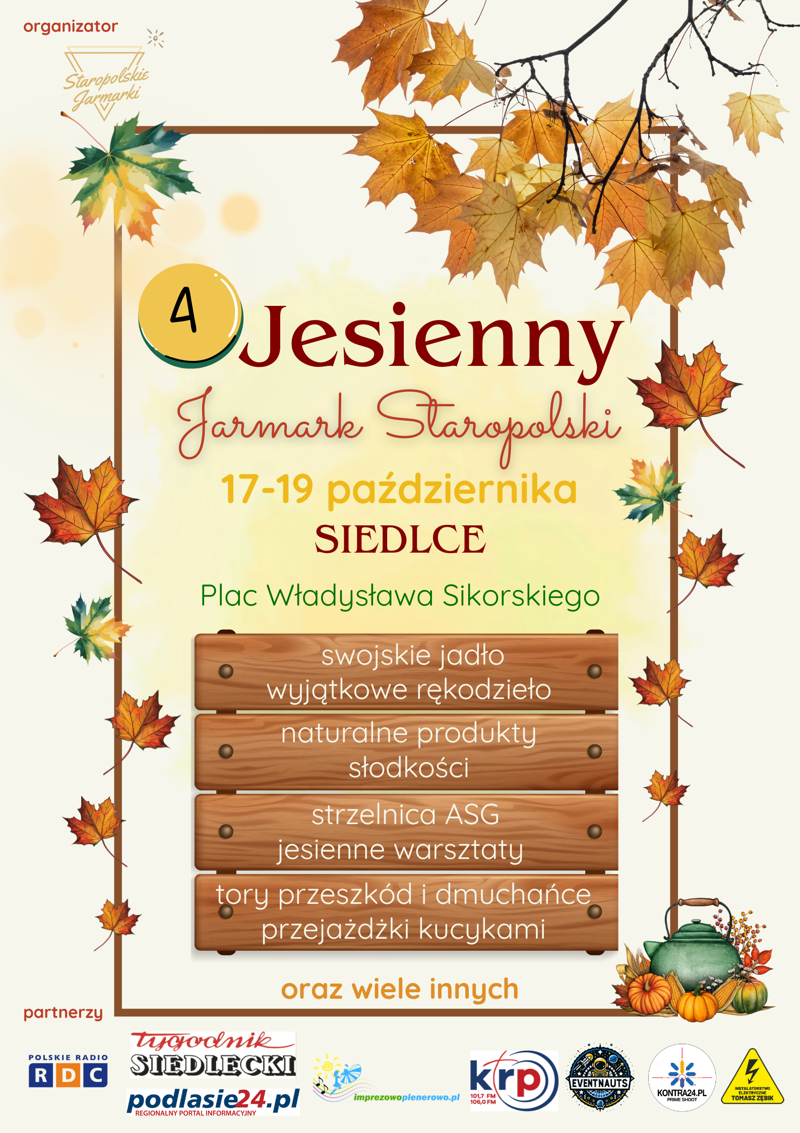 Jesień w Siedlcach zapowiada się wyjątkowo barwnie. W dniach 17–19 października po raz czwarty serce miasta wypełni się zapachem tradycyjnych potraw, dźwiękami muzyki ludowej oraz kolorami rękodzieła z różnych zakątków Polski i spoza jej granic. Na Placu Władysława Sikorskiego odbędzie się 4. Jesienny Jarmark Staropolski, organizowany przez Staropolskie Jarmarki.
