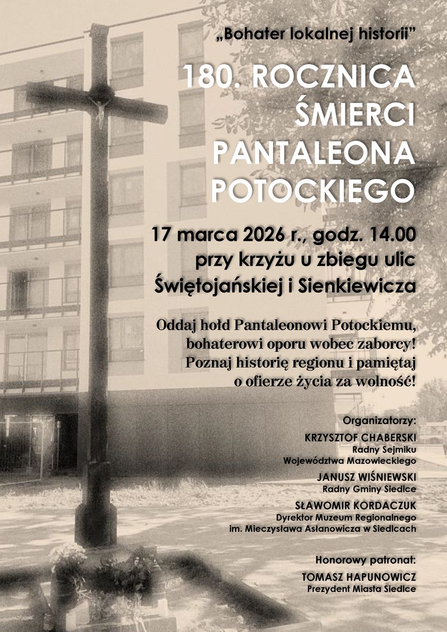 W 2026 roku przypada 180. rocznica śmierci Pantaleona Potockiego, dawnego właściciela majątku w miejscowości Cisie (obecnie Cisie-Zagrudzie w gminie Kotuń). Organizator zrywu zbrojnego w Siedlcach, którego celem było wywołanie powstania w zaborze rosyjskim jako wsparcia dla powstania krakowskiego z 1846 roku. Za udział w działaniach przeciwko carskiemu zaborcy został skazany na śmierć. Publiczna egzekucja przez powieszenie, przeprowadzona 17 marca 1846 roku na zawsze zapisała się w historii miasta jako jeden z najbardziej tragicznych symboli walki o wolność w naszym regionie.W 180. rocznicę tych wydarzeń, 17 marca o godz. 14.00 przy krzyżu u zbiegu ulic Świętojańskiej i Sienkiewicza w Siedlcach odbędzie się uroczystość upamiętniająca Pantaleona Potockiego. To właśnie w tym miejscu, nawiązującym do tragicznej historii egzekucji, mieszkańcy będą mogli wspólnie oddać hołd bohaterowi.