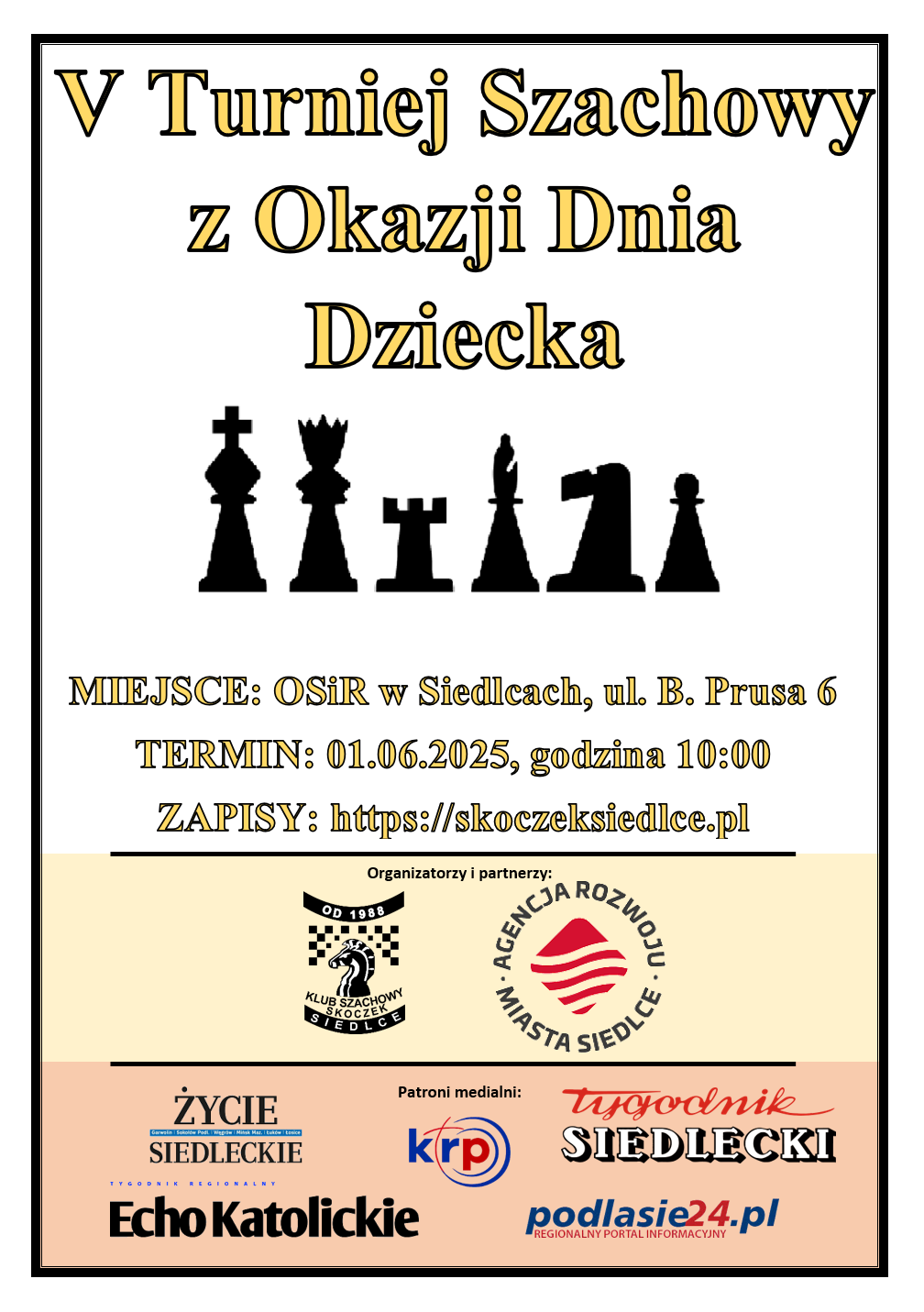 V Turniej Szachowy z Okazji Dnia Dziecka, organizowany przez Klub Szachowy „Skoczek” Siedlce, odbędzie się w niedzielę, 1 czerwca, w Ośrodku Sportu ARMS przy ul. Bolesława Prusa 6 w Siedlcach.