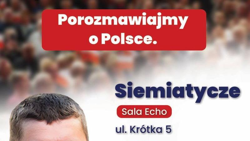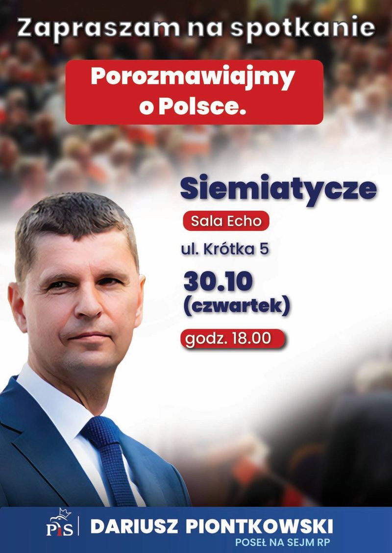 „Porozmawiajmy o Polsce” - pod tym hasłem w Siemiatyczach odbędzie się otwarte spotkanie z posłem na Sejm RP, Dariuszem Piontkowskim. Będzie to okazja, by wysłuchać wystąpienia posła oraz zadać pytania dotyczące bieżącej sytuacji politycznej, spraw regionu i przyszłości Polski.