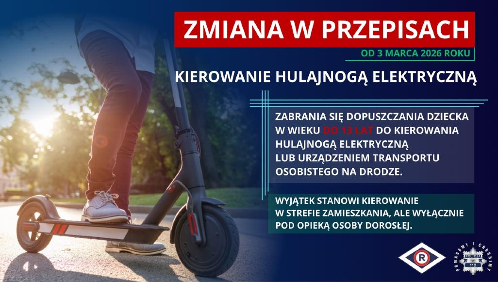Od 3 marca minimalny wiek osoby kierującej hulajnogą wynosi 13 lat. Osoby między 13. a 18. rokiem życia muszą posiadać kartę rowerową lub odpowiednie uprawnienia. Wyjątkiem jest strefa zamieszkania – tam młodsze osoby mogą korzystać z hulajnogi wyłącznie pod opieką osoby dorosłej.