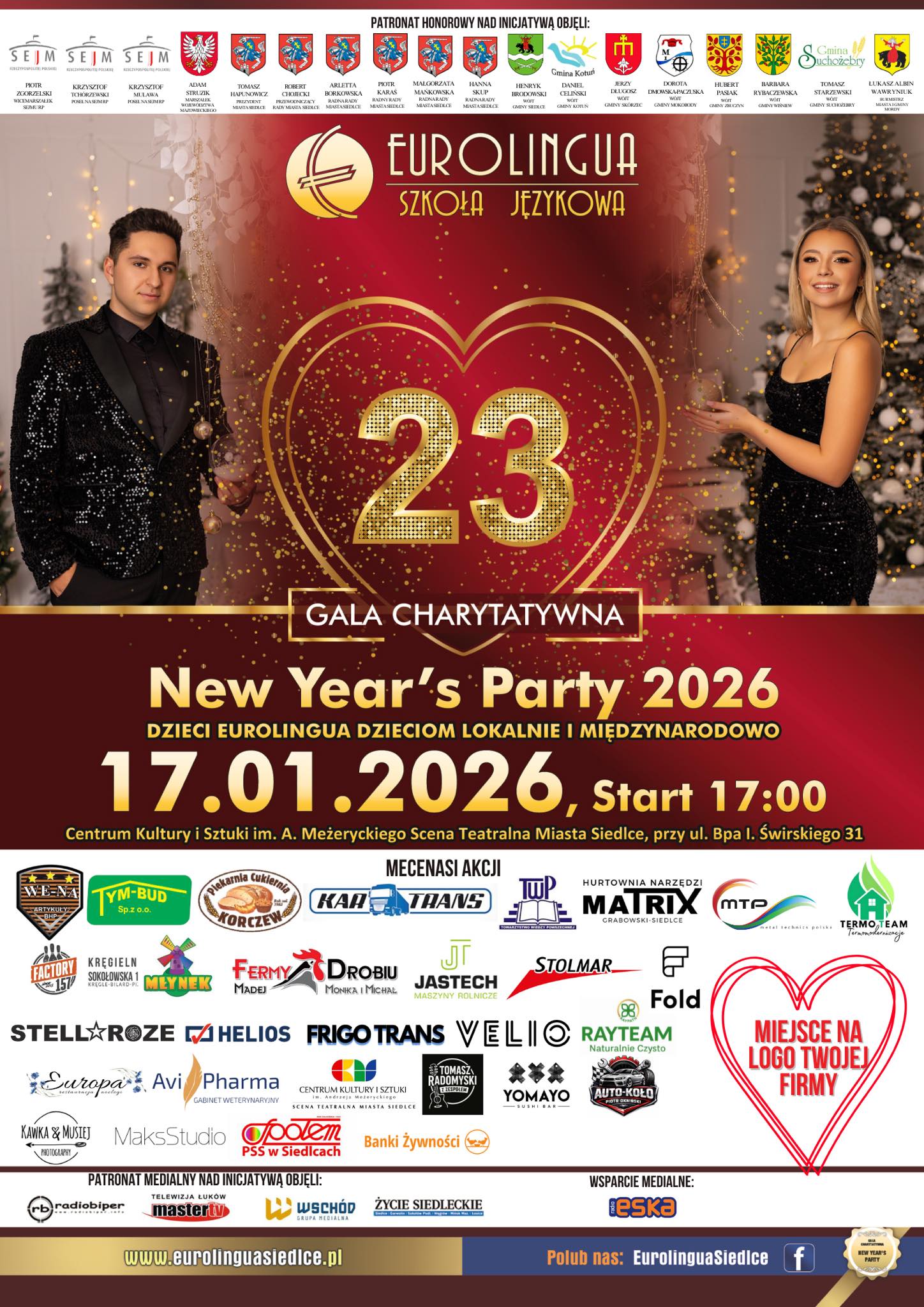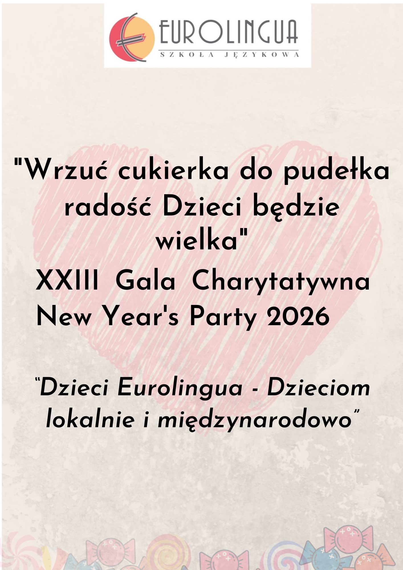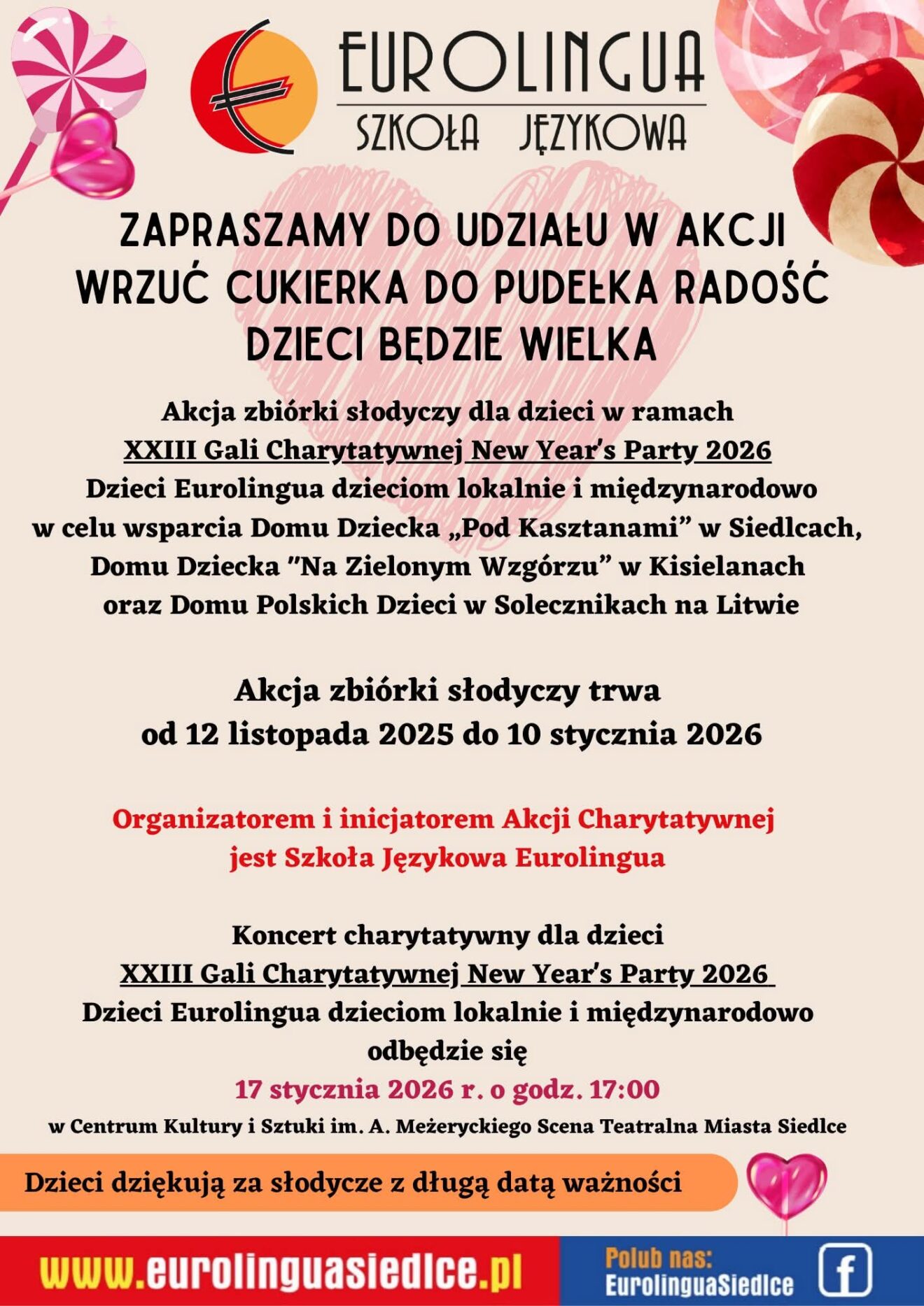 Trwa odliczanie do XXIII Gali Charytatywnej New Year’s Party 2026, organizowanej przez Szkołę Językową Eurolingua w Siedlcach. Jednym z towarzyszących wydarzeniu działań jest akcja charytatywna pod hasłem „Wrzuć cukierka do pudełka – radość dzieci będzie wielka!”, której celem jest wsparcie dzieci z domów dziecka w regionie oraz poza granicami kraju.