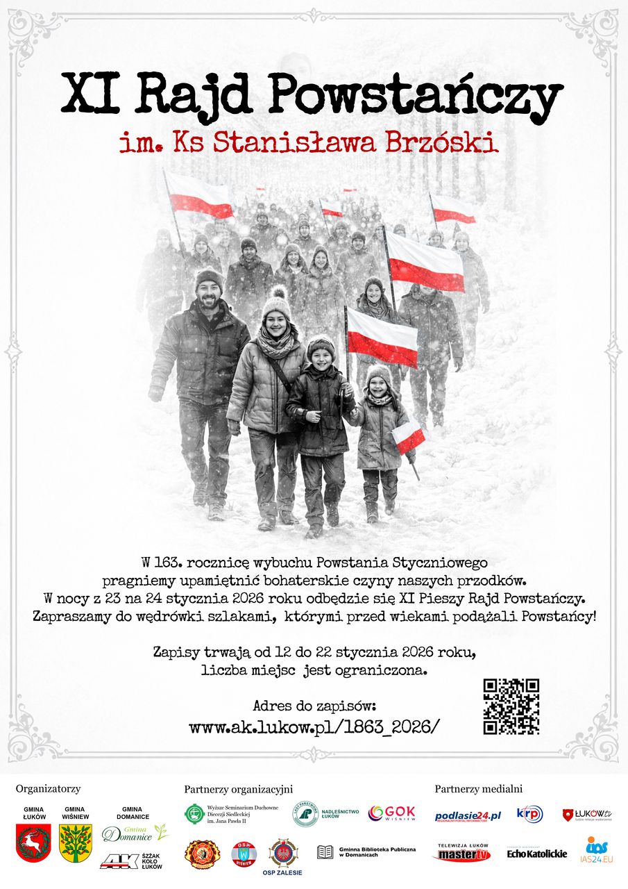 „Jako grupa ludzi, pasjonatów historii, którym zależy na przypominaniu o historii naszej Małej Ojczyzny naznaczonej niezliczoną ilością krzyży zapraszamy Państwa do posmakowania pieszych dróg, którymi przed wiekami przemieszczali się Powstańcy - często w śniegu i na mrozie. W tym roku przypada też 152 rocznica brutalnych mordów w Drelowie i Pratulinie. Unici broniąc swej wiary tak jak powstańcy broniąc Ojczyzny nie wahali się oddać swego życia. Wszystkie te i późniejsze wydarzenia składają się na opór Polaków wobec Rosji, która mimo zmian nazwy i ustrojów, wciąż jest taka sama i ciągle dąży do narzucenia sąsiednim narodom swej woli” – piszą w zaproszeniu do udziału w rajdzie organizatorzy, wśród których są m.in. gmina Łuków i gmina Wiśniew oraz Koło Łuków Światowego Związku Żołnierzy Armii Krajowej.W tym roku rajd odbędzie się już po raz jedenasty. Jego uczestnicy wyruszą z Łukowa, Wiśniewa i Domanic. Wszystkie grupy wyjdą w piątek 23 stycznia popołudniem i wieczorem, aby tuż przed północą spotkać się przy pomniku księdza Brzóski w Jacie. Zapisy ruszyły. Potrwają do 22 stycznia. Liczba miejsc jest ograniczona.