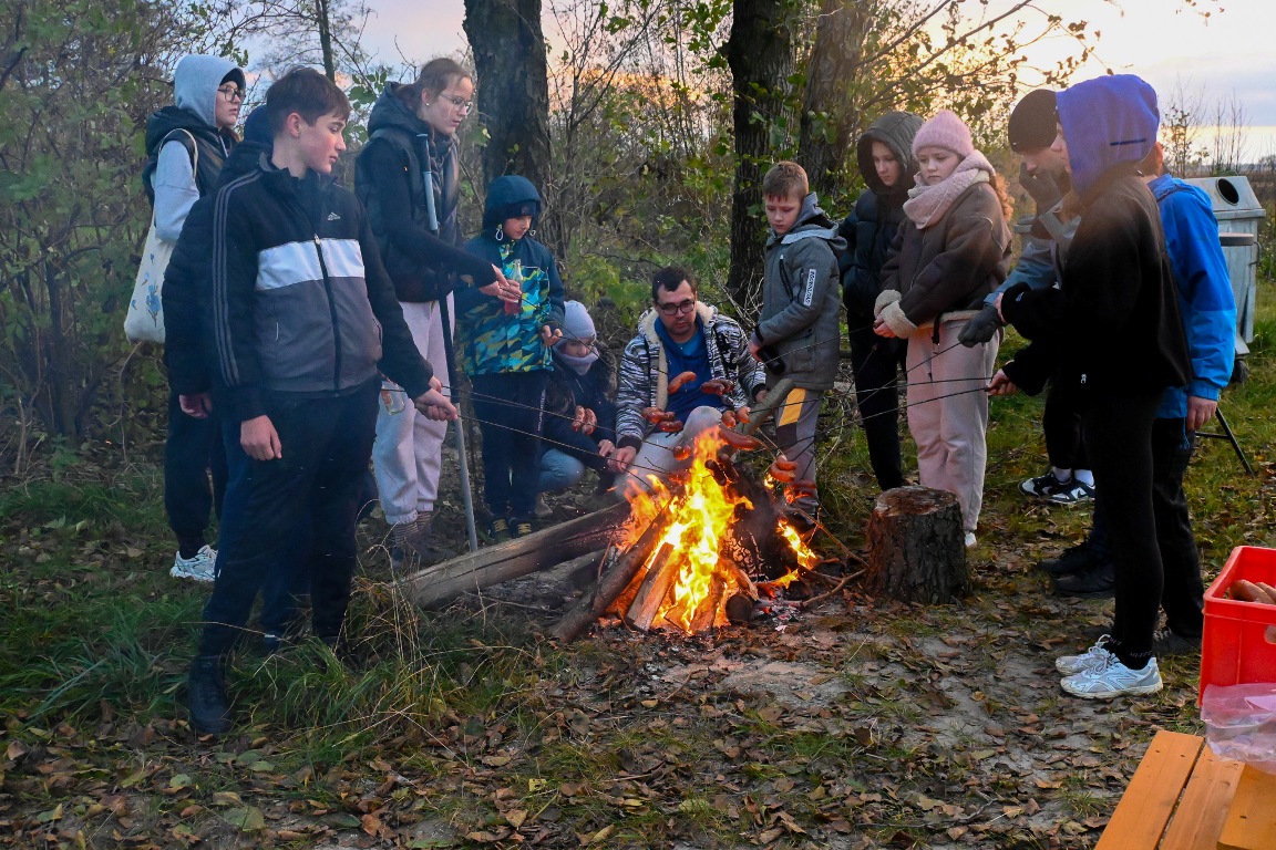 Po zakończeniu porządków przyszedł czas na chwilę odpoczynku i wspólne spotkanie przy ognisku nad stawem za cmentarzem. Czekały tam kiełbaski, ciepła herbata, domowe wypieki i przede wszystkim – dobra atmosfera oraz rozmowy, które jeszcze bardziej zbliżyły uczestników.