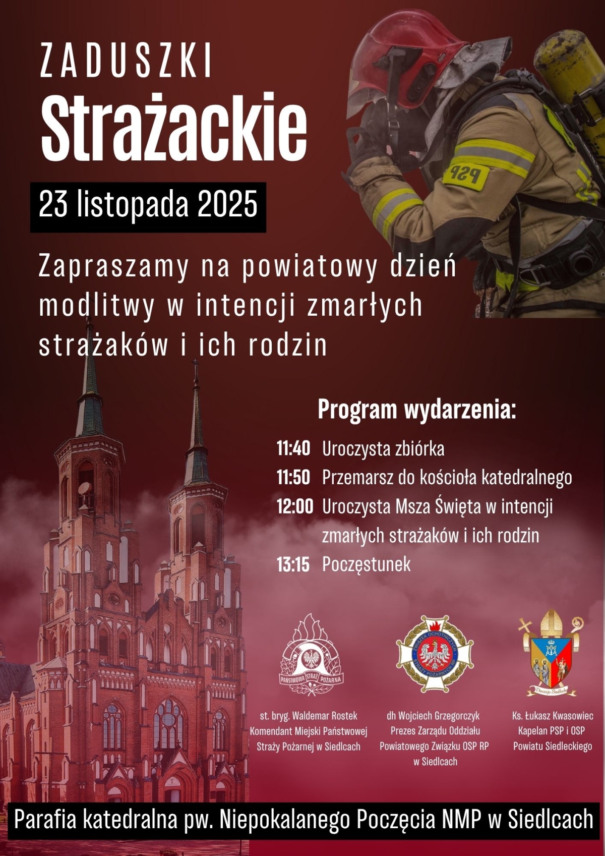 W sobotę, 23 listopada, w siedleckiej katedrze zostanie odprawiona Msza święta w intencji zmarłych strażaków Państwowej Straży Pożarnej w Siedlcach oraz Ochotniczych Straży Pożarnych z powiatów: siedleckiego, węgrowskiego i mińskiego.