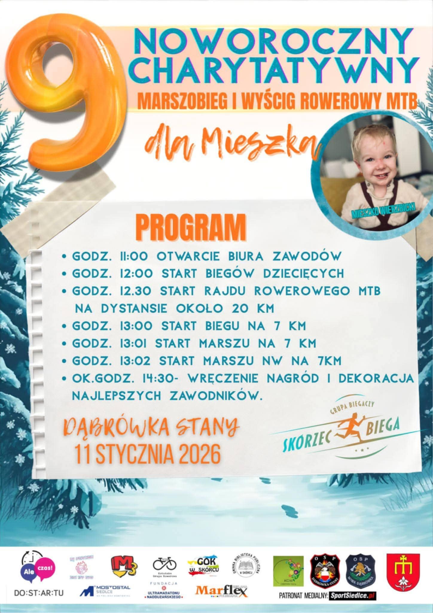 Organizatorzy – Grupa Biegaczy Skórzec Biega – zaplanowali biegi dla dzieci, wyścig rowerowy MTB na dystansie 20 km, a także bieg, nordic walking oraz marsz na dystansie 7 km.Podczas wydarzenia zbierane będą środki na leczenie Mieszka Wierzbickiego z Żelkowa. Chłopiec choruje na pęcherzowe oddzielanie się naskórka – rzadką, genetyczną i bardzo bolesną chorobę. Niezbędne są codzienne opatrunki, które chronią jego skórę.