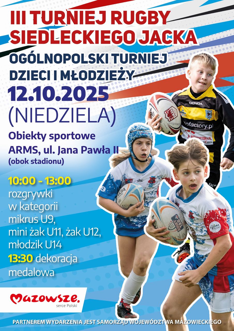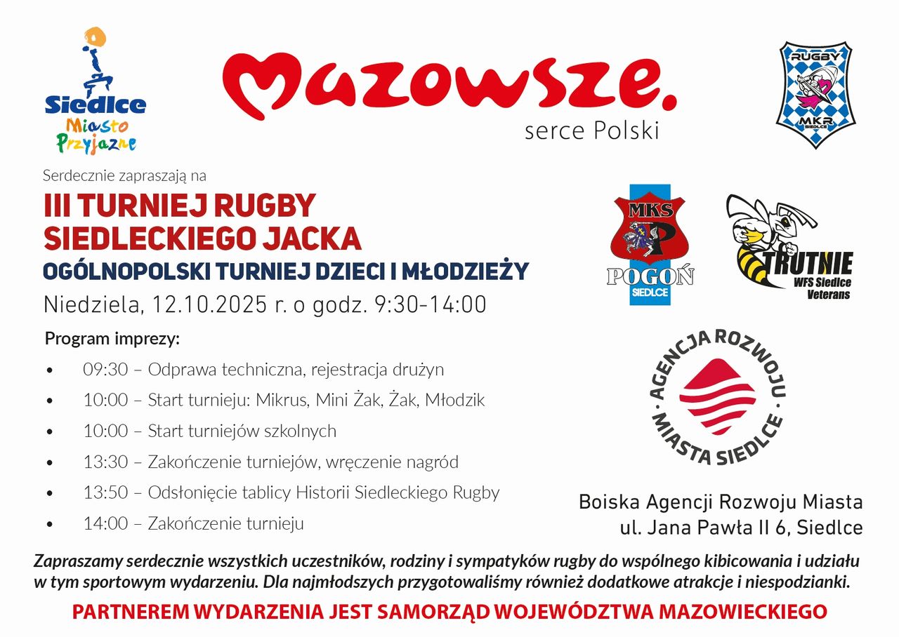 Już po raz trzeci w Siedlcach odbędzie się Turniej Rugby Siedleckiego Jacka. Rozgrywki zaplanowano na niedzielę 12 października. miejscem spotkania dzieci i młodzieży będzie boisko Agencji Rozwoju Miasta Siedlce przy ul. Jana Pawła II.