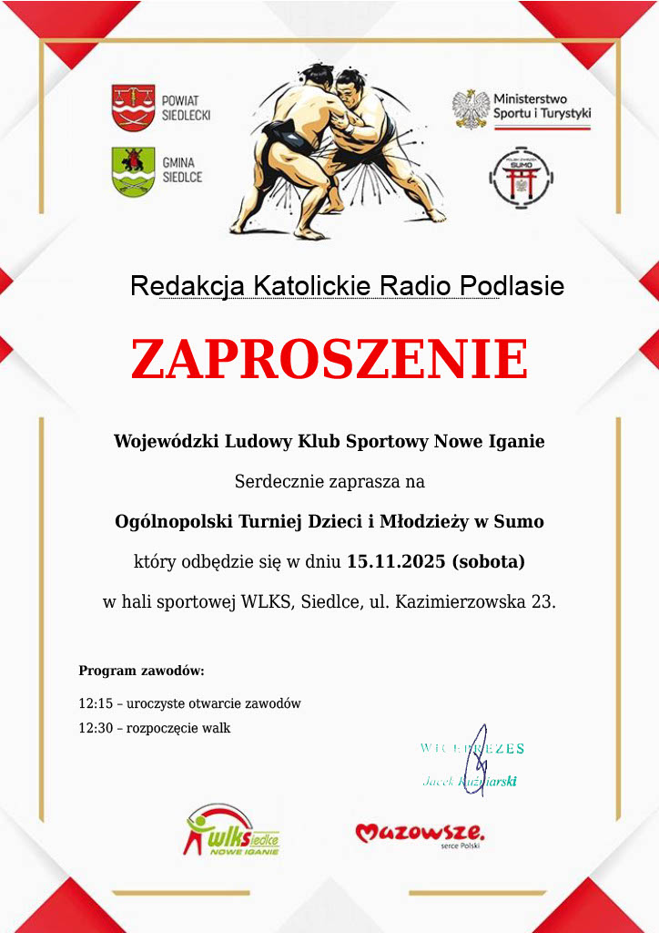 Ogólnopolski Turniej Dzieci i Młodzieży w Sumo odbędzie się w hali sportowej WLKS w Siedlcach. Organizatorem wydarzenia jest Wojewódzki Ludowy Klub Sportowy Nowe Iganie, a wspierają go powiat siedlecki, gmina Siedlce, Ministerstwo Sportu i Turystyki oraz samorząd Mazowsza.Turniej rozpocznie się o godzinie 12:15 uroczystym otwarciem zawodów, a już od 12:30 młodzi zawodnicy z całej Polski rozpoczną sportową rywalizację na macie.