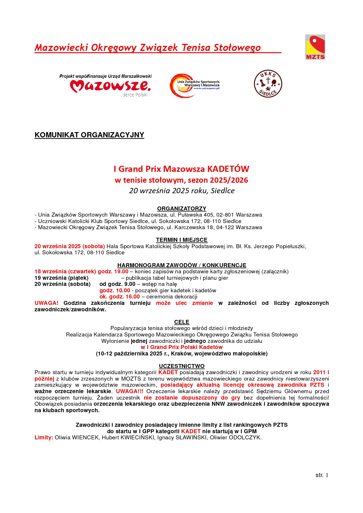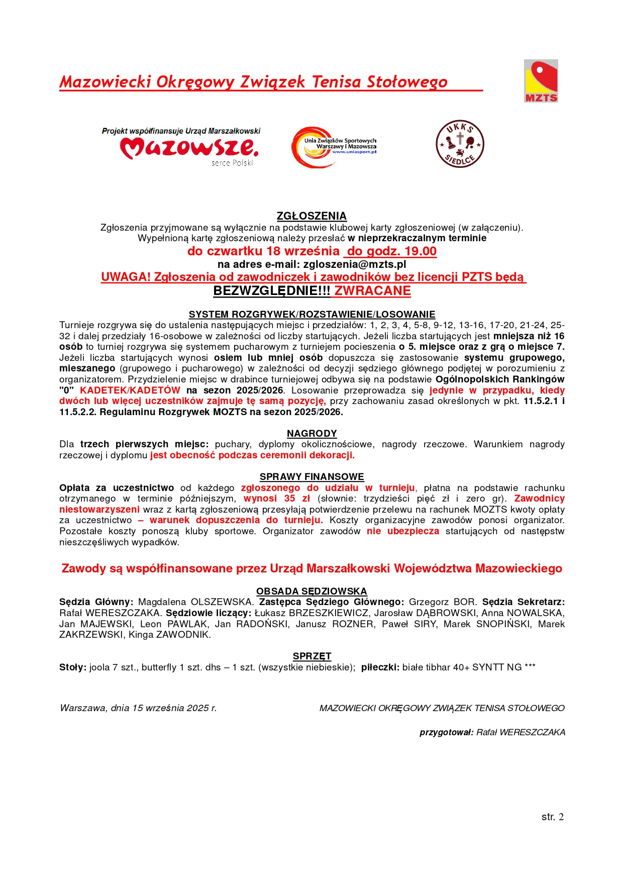 Organizatorami są Mazowiecki Okręgowy Związek Tenisa Stołowego, Unia Związków Sportowych Warszawy i Mazowsza oraz Uczniowski Katolicki Klub Sportowy Siedlce. Projekt współfinansuje Urząd Marszałkowski Województwa Mazowieckiego.W turnieju mogą wziąć udział zawodnicy z licencją na sezon 2025/2026. Zgłoszenia przyjmowane są do czwartku, 18 września, do godziny 19:00, wyłącznie za pomocą karty zgłoszeniowej. Brak aktualnej licencji eliminuje zawodnika z udziału w turnieju.