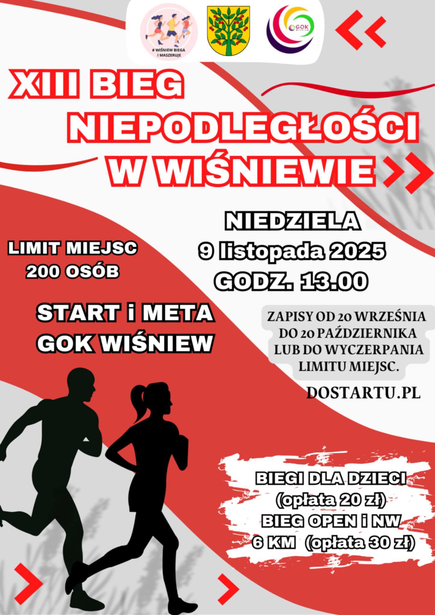 Zaplanowano dystanse dla dorosłych i dzieci oraz marsz nordic walking. Zapisy na 13. Bieg Niepodległości w Wiśniewie prowadzone są za pośrednictwem strony dostartu.pl. Warto się pospieszyć, ponieważ obowiązuje limit uczestników.