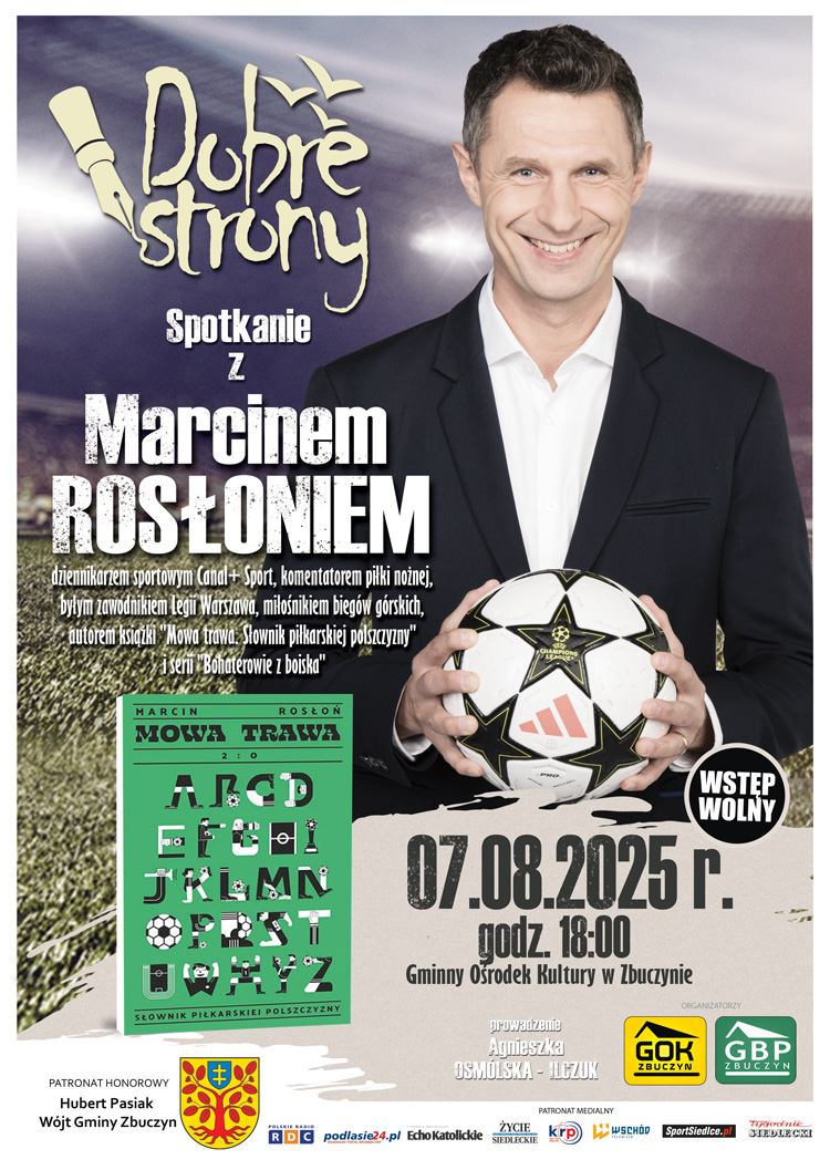 Marcin Rosłoń, znany dziennikarz telewizyjny i komentator sportowy, a także piłkarz, zawodnik sportów biegowych i autor książek, odwiedzi Gminny Ośrodek Kultury w Zbuczynie. Otwarte spotkanie dla mieszkańców regionu odbędzie się w czwartek, 7 sierpnia o 18.00 w ramach cyklu „Dobre Strony”. Będzie połączone z promocją książki „Mowa trawa. Słownik piłkarskiej polszczyzny”.